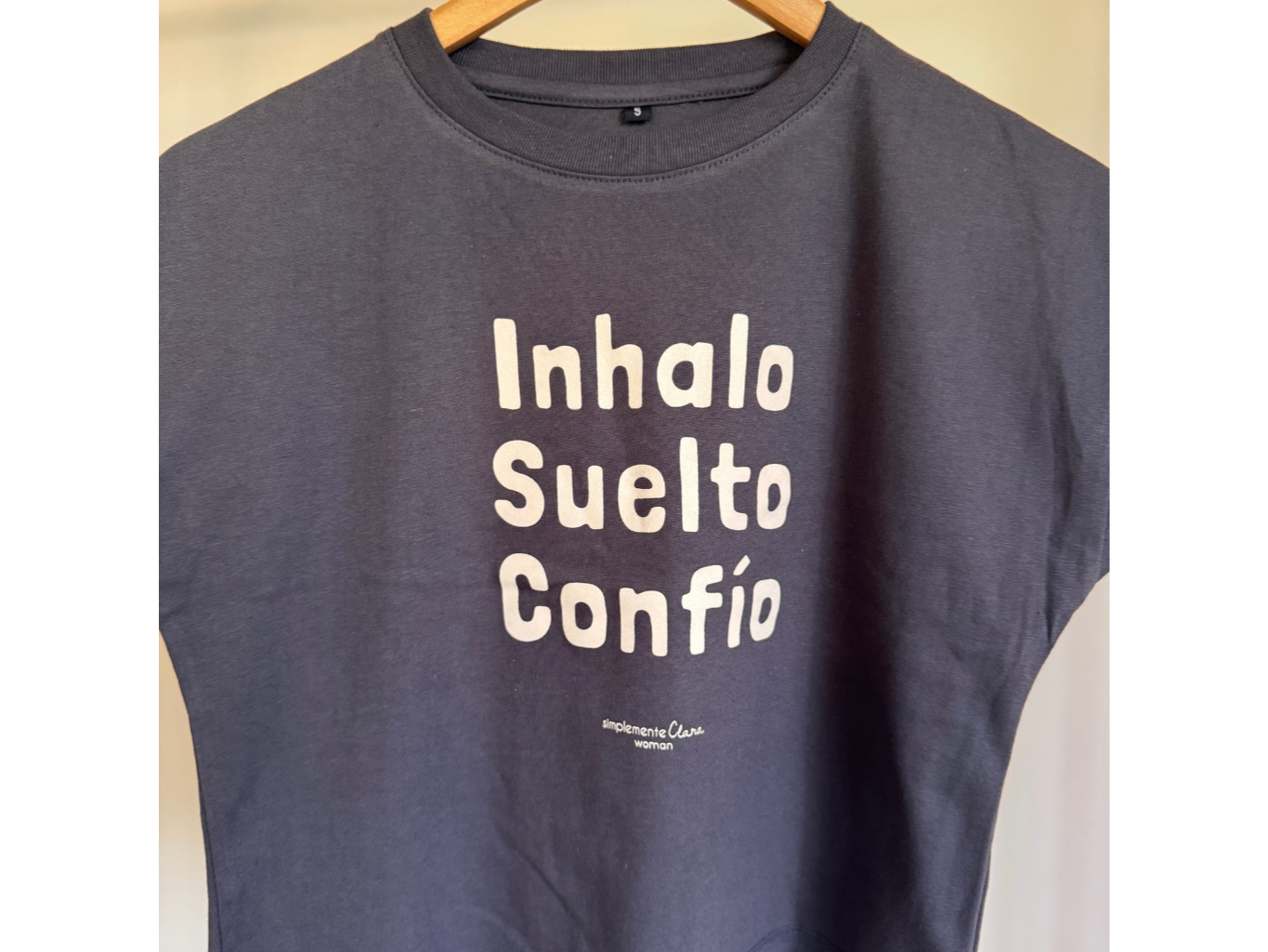 La Remera Inhalo Suelto Confío es más que una prenda, es un recordatorio de calma y presencia. El diseño presenta un mensaje inspirador en una llamativa serigrafía dorada sobre tela de algodón color gris oscuro. Este contraste aporta elegancia y un toque místico.