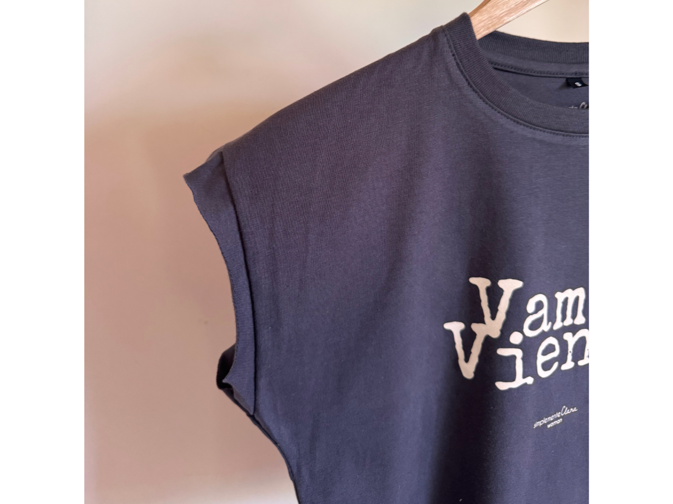 La Remera Vamos Viendo es la compañera ideal para esos días en los que fluyes con la vida. Su frase icónica está impresa en serigrafía color blanco antiguo sobre un algodón gris oscuro de primera calidad, creando un contraste vibrante y duradero. La tipografía vintage y el pequeño sello inferior le dan un toque original y artesanal.