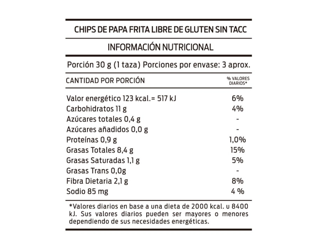 Chips de papas rústicas con sal marina Compartir por WhatsApp Copiar enlace Para picar sin pensar demasiado. ¿No te vas a dar el gusto? Chips de papas rústicas con sal marina (80 g), sin gluten.$1.690 Observaciones 0 / 150