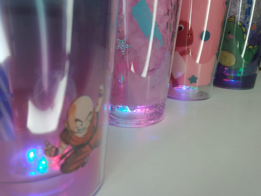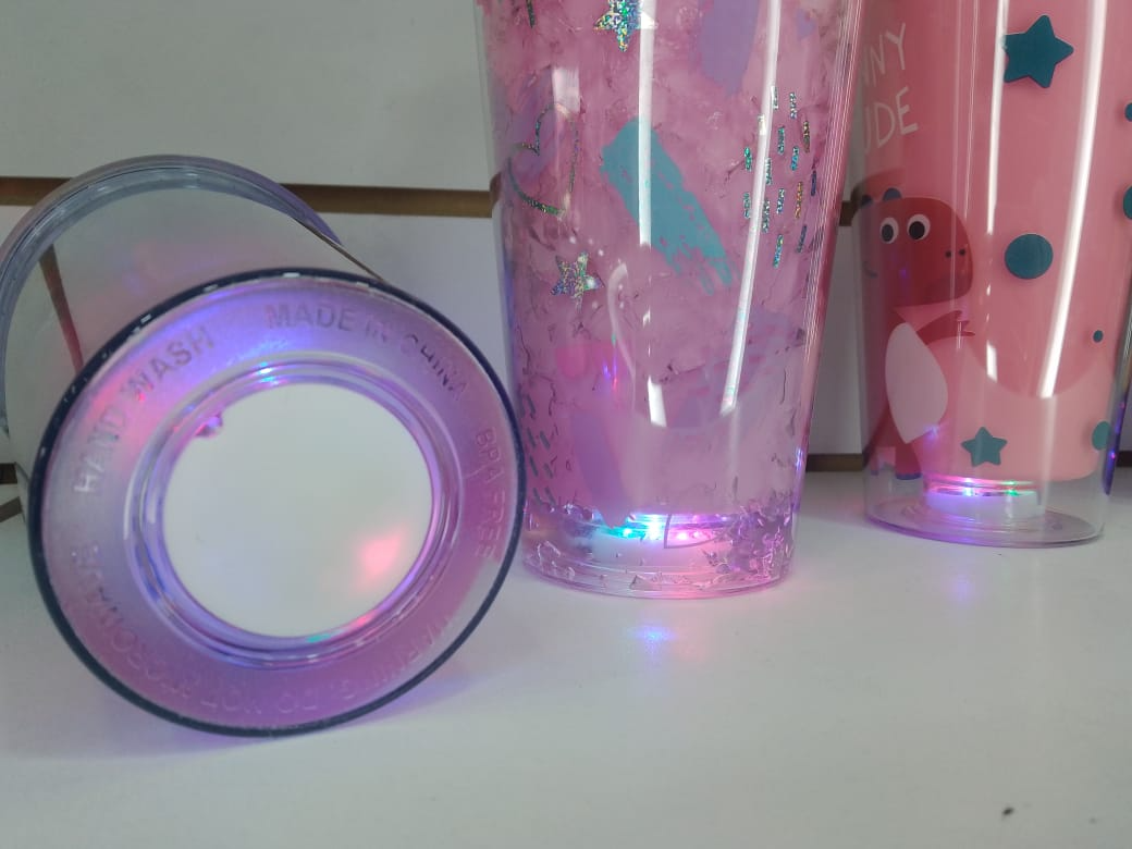 VASO PLASTICO DOBLE CAPA TRANSPARENTE CON LUZ Y GLITER - COD.: 285