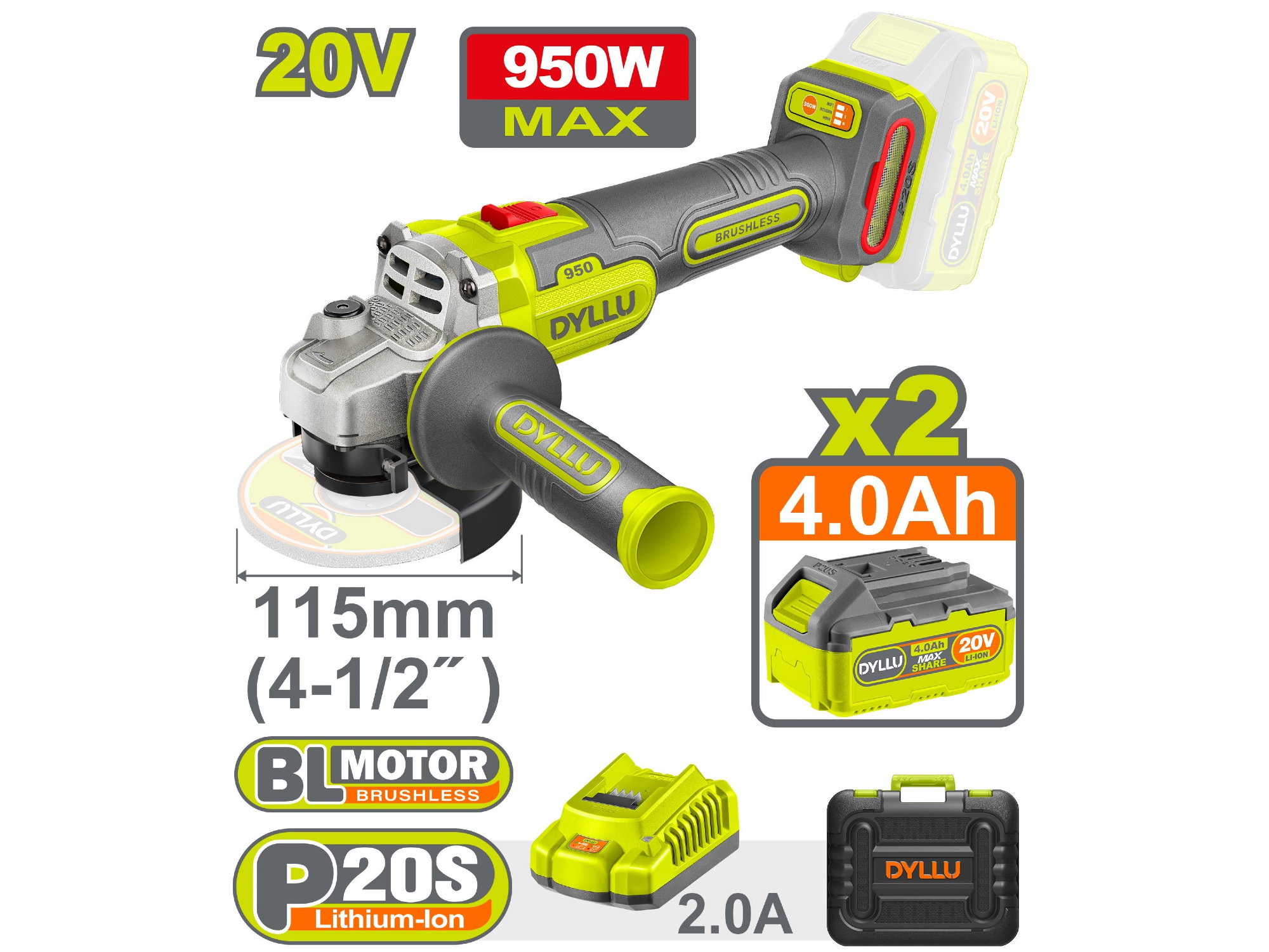 Amoladora Angular 20V BL 950W 9000rpm 115mm (MALETIN, CARGADOR, Y 2 BATERIAS 4Ah)