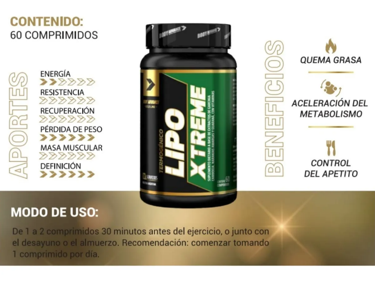 4 unidades en stock LIPO XTREME de Body Advance es un suplemento herbal diseñado específicamente para quienes buscan optimizar su rendimiento físico y alcanzar sus objetivos de pérdida de grasa. Cada pote contiene 60 comprimidos que facilitan la incorporación de este quemador de grasas en tu rutina diaria, ayudando a potenciar tu metabolismo y a mejorar la energía durante tus entrenamientos.