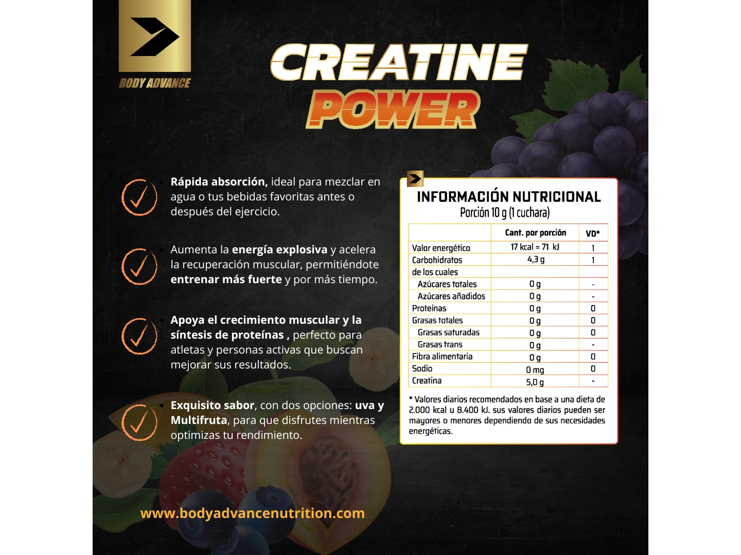Nuevas creatinas saborizadas De Body Advance! Beneficios Destacados: – Exquisito sabor : Disponible en dos deliciosos sabores: Uva y Multifruta, para que disfrutes mientras optimizas tu rendimiento. – 300 gramos por envase, ofreciendo 30 servicios de 10 gramos cada uno. – 5 gramos de creatina por porción : La cantidad óptima para mejorar la fuerza, potencia y resistencia durante tus entrenamientos. – Fácil disolución: Polvo de rápida absorción, ideal para mezclar en agua o tus bebidas favoritas antes o después del ejercicio. – Mejora el rendimiento físico : Aumenta la energía explosiva y acelera la recuperación muscular, permitiéndote entrenar más fuerte y por más tiempo. – Apoya el crecimiento muscular y la síntesis de proteínas : Perfecto para atletas y personas activas que buscan mejorar sus resultados. – Fórmula avanzada saborizada : Una creatina deliciosa que hace que suplementarse sea una experiencia placentera y efectiva