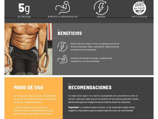 La mejor Creatina del mercado. Es monohidrato pura, sin sabor, micronizada y ultra fina.