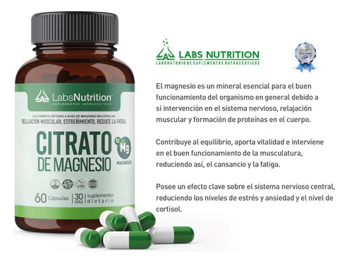 2 unidades en stock Citrato de Magnesio 400 mg de Labs Nutrition es un suplemento alimenticio diseñado para aquellos que buscan mejorar su bienestar general y rendimiento físico. Cada frasco contiene 60 cápsulas, proporcionando una dosis efectiva de citrato de magnesio, un mineral esencial que contribuye a la función muscular y al equilibrio electrolítico.