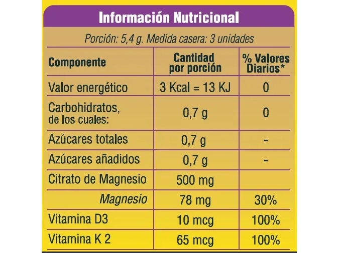 Dr Food Citrato De Magnesio Geonat 90 Gomitas Sabor Uva es una opción ideal para quienes buscan un soporte nutricional efectivo. Cada botella contiene 90 gomitas masticables, proporcionando una forma deliciosa y práctica de incorporar el citrato de magnesio a tu rutina diaria. Este suplemento no contiene gluten ni lactosa, y está formulado con vitamina D3 y K2, potenciando así sus beneficios para la salud ósea y cardiovascular. Recomendado para adultos a partir de 18 años, el Citrato de Magnesio contribuye al equilibrio mineral y a la función muscular, ayudando a reducir el cansancio y la fatiga. Cada porción de 3 g asegura que recibas una dosis eficaz para complementar tus necesidades nutricionales. Con un formato atractivo, estas gomitas son perfectas para llevar a cualquier lugar y disfrutar en cualquier momento. Opta por Citrato de Magnesio Geonat Dr Food y experimenta una forma más fácil y agradable de cuidar tu salud. Dale a tu cuerpo el apoyo que merece y mejora tu bienestar diario con cada gomita. Este producto es una excelente adición a tu estilo de vida saludable. Suplemento dietario a base de Magnesio, Vitamina D3 y Vitamina K2 en pastillas de goma libre de gluten.