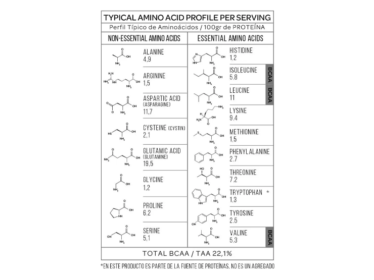Contiene 25 gr. de proteína que ayuda al desarrollo muscular y 5.5 gr. de BCAAs generados naturalmente que contribuyen al rendimiento y la resistencia.