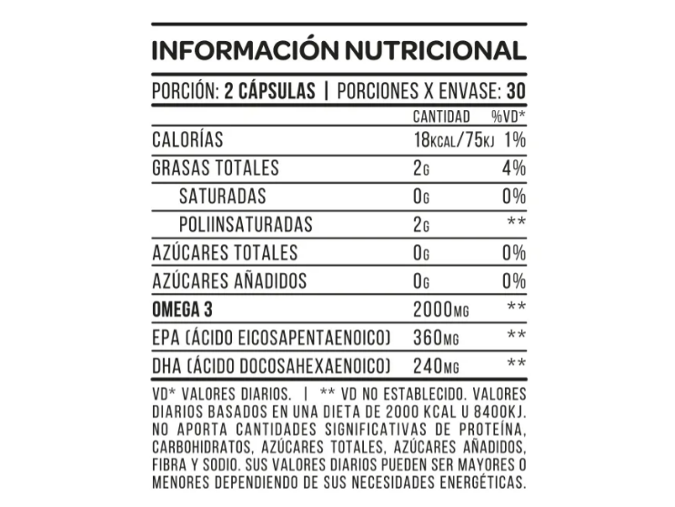 Omega 3 Fish Oil es un suplemento alimenticio con aceites Omega 3, EPA y DHA ultra concentrados y destilados molecularmente, provenientes de fuentes de pescado de alta calidad. Contiene EPA 300 mg y DHA 400 mg por porción. Estas grasas saludables son esenciales para la función cerebral, cardiovascular y del sistema inmunológico, además de contribuir a la salud de las articulaciones y al mantenimiento del sistema nervioso. Favorecen la síntesis de hormonas que pueden influir en el crecimiento de la masa muscular y en la optimización de la quema de grasa corporal, lo que puede ser beneficioso para la definición muscular. Modo de Uso: Se recomienda la ingesta de 2 cápsulas blandas diariamente.
