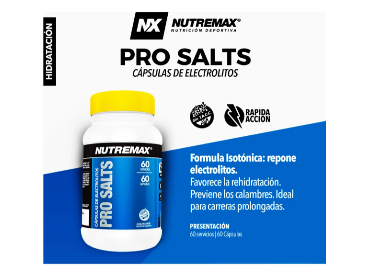Las cápsulas PROSALTS son muy cómodas e ideales para cualquier persona que necesite mantener la energía, la hidratación y función muscular adecuada en condiciones de estrés por calor y/o máximo esfuerzo.