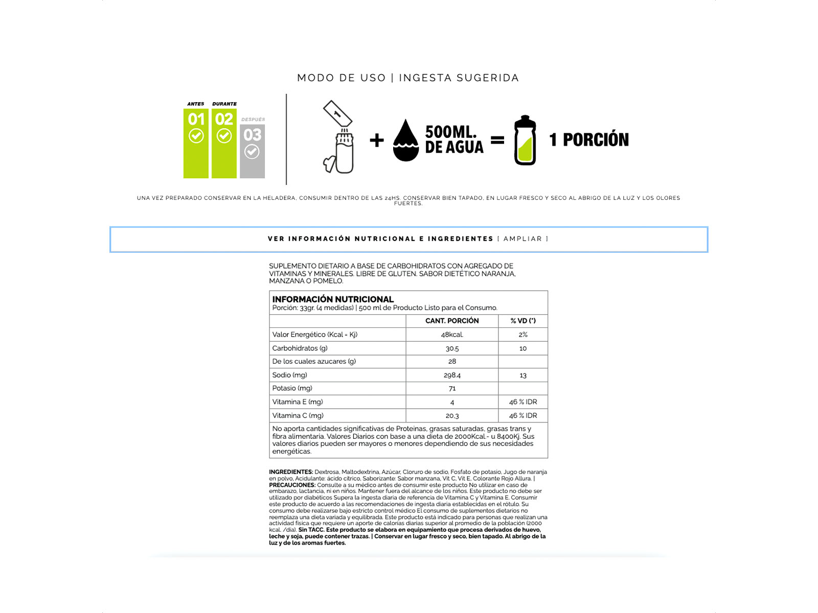 Su exclusiva fórmula, fuente de vitaminas C y E, aporta carbohidratos, retrasa la fatiga y mejora el rendimiento físico.