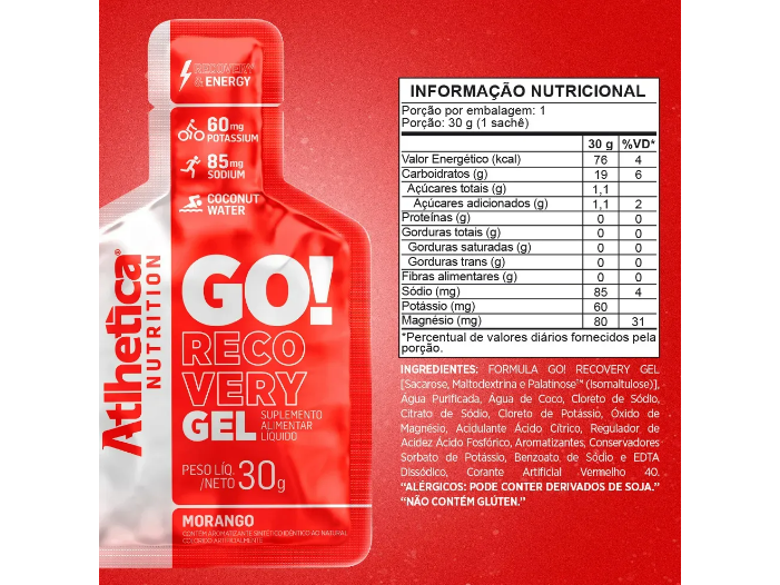 Cada sachet de 30g de GO! Recovery Gel te aporta 19 g de carbohidratos, 85 mg de Sodio, 60 mg de Potasio y 80 mg de Magnesio. Todos estos componentes trabajan en sinergia para apoyarte en tu fase de recuperación y para mantener tu energía.