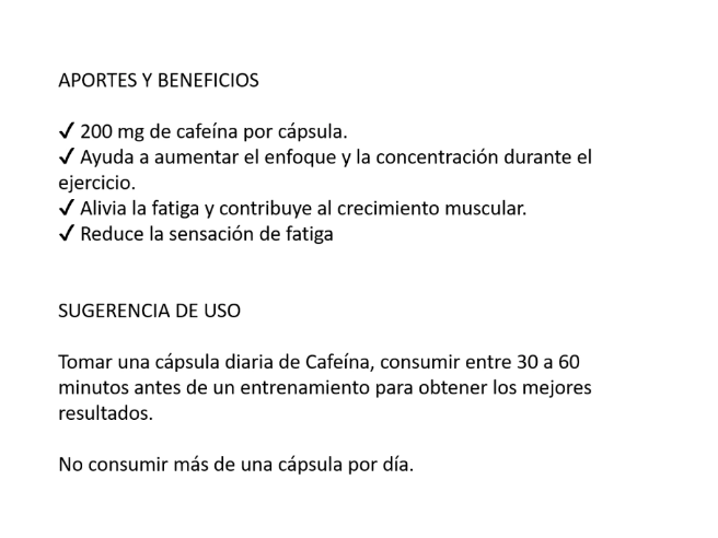 Modo de uso: Tomar 1 cápsula 30 minutos antes del entrenamiento o cuando necesites un impulso de energía. No consumir después de las 18hs o si eres sensible a la cafeína. No exceder 2 cápsulas al día.