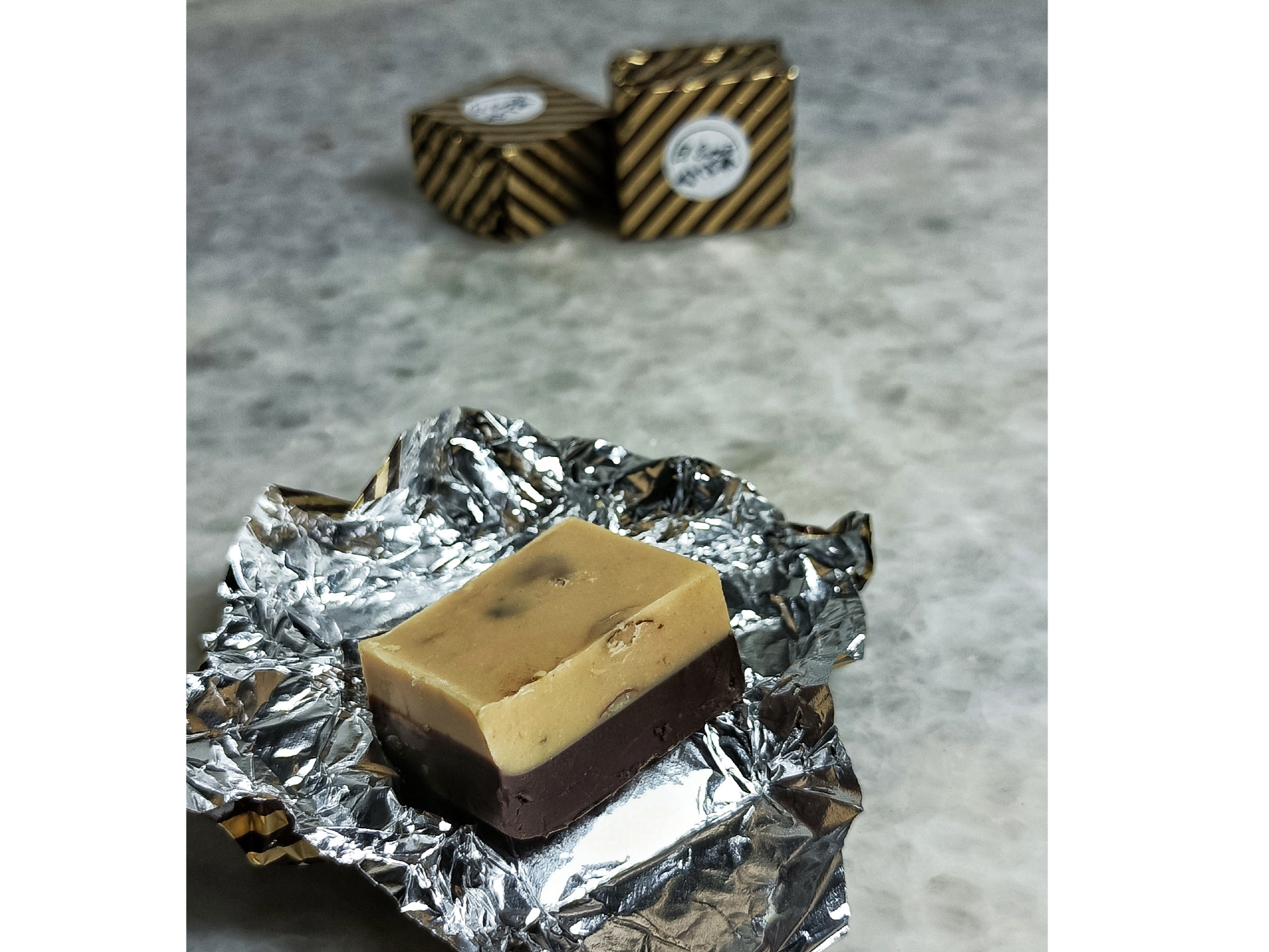 Marroc super sambayón Ingredientes: Chocolate semi amargo, chocolate blanco, pasta de maní, reducción de marsala, almendras tostadas. Presentación: Papel dorado a rayas marrones (cuadrado mas alto) 13 g