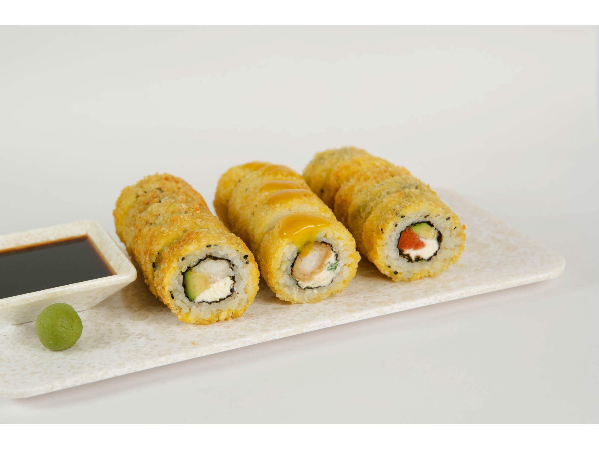 Combo hot de salmon trout y langostinos. Piezas: Hot New York con Phila, Hot Futurama, Hot Shrimp.