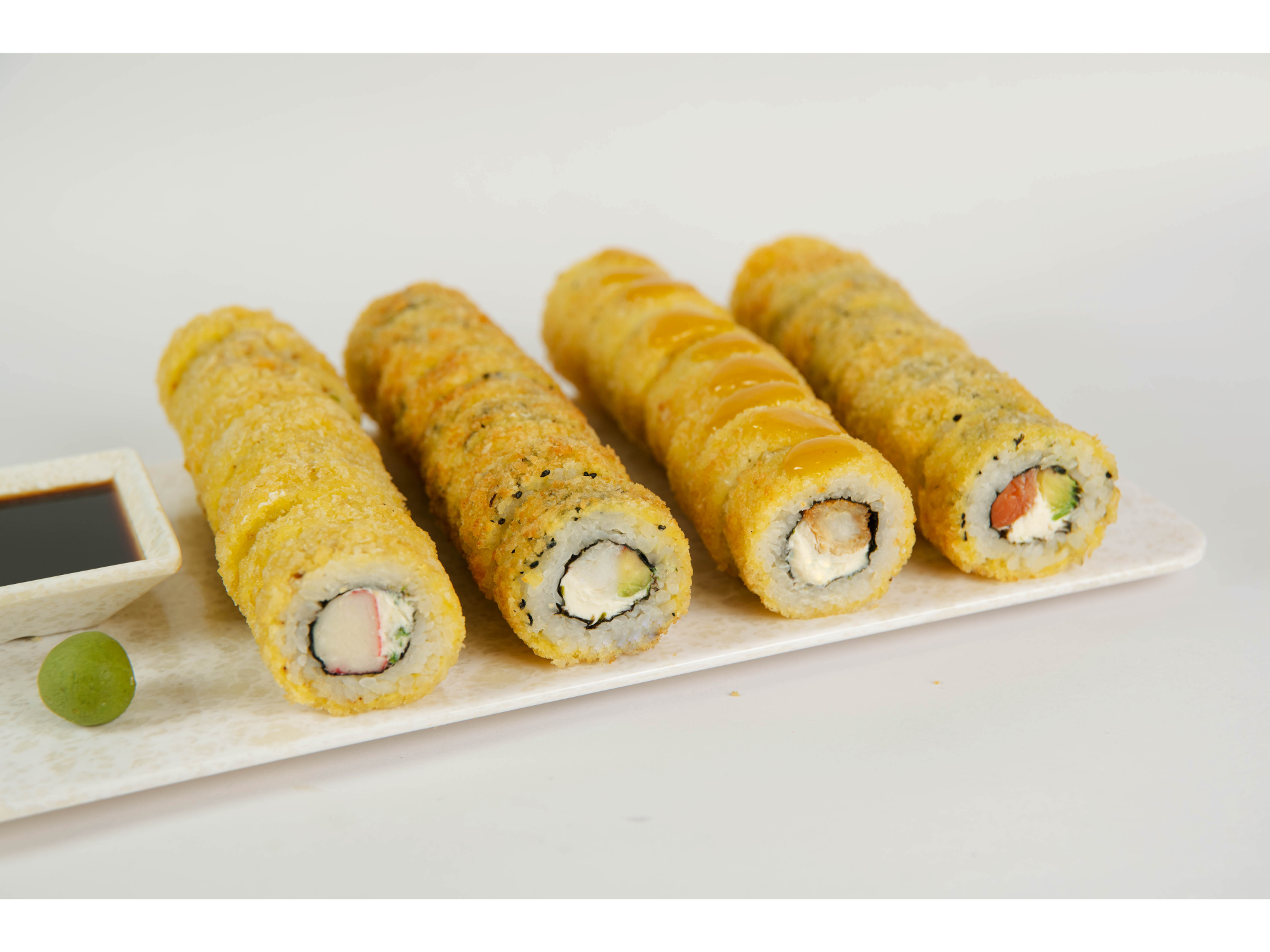 Combo hot de salmon trout, langostinos y kanikama. Piezas: Hot New York Phila, Hot Futurama, Hot Shrimp, Hot Calboom.