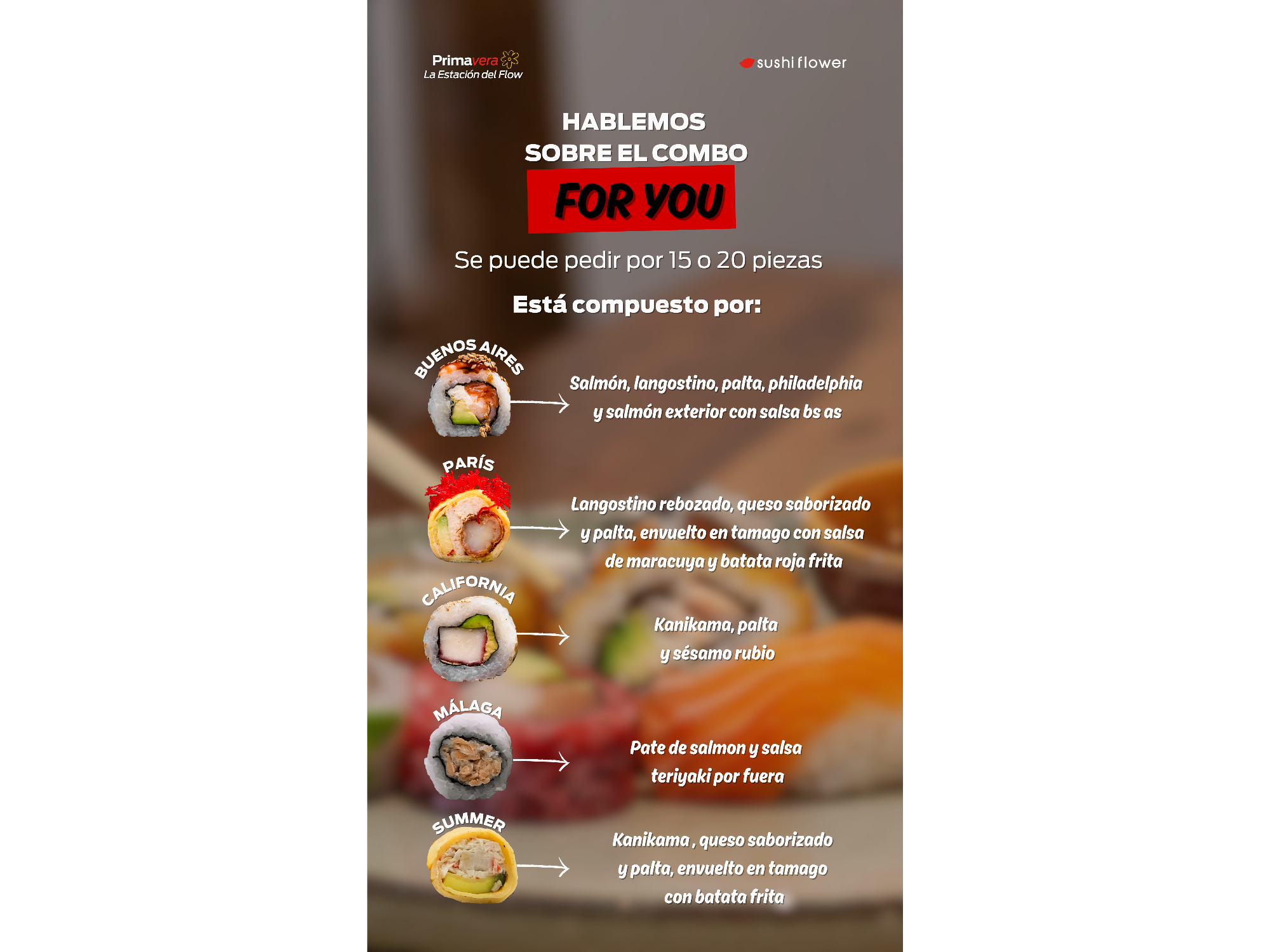 COMBO FOR YOU Compartir Bsas/paris/california/malaga/summer Presentaciones Seleccioná las opciones que quieras.15 PIEZAS$15.50020 PIEZAS$21.500 Personalizá tu selección Las siguientes opciones aplican para cada producto agregado. SALSAS Seleccioná una opción. Obligatorio SOJABS ASTERIYAKI VARIOS Seleccioná las opciones que quieras.PALITOSWASABIJENGIBRE Observaciones 0 / 150