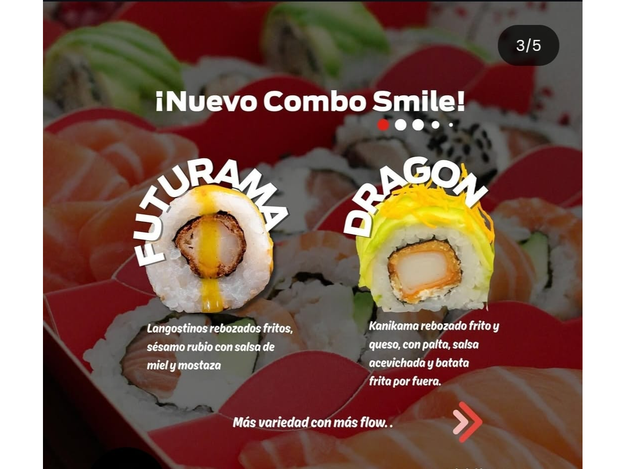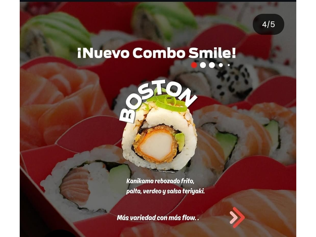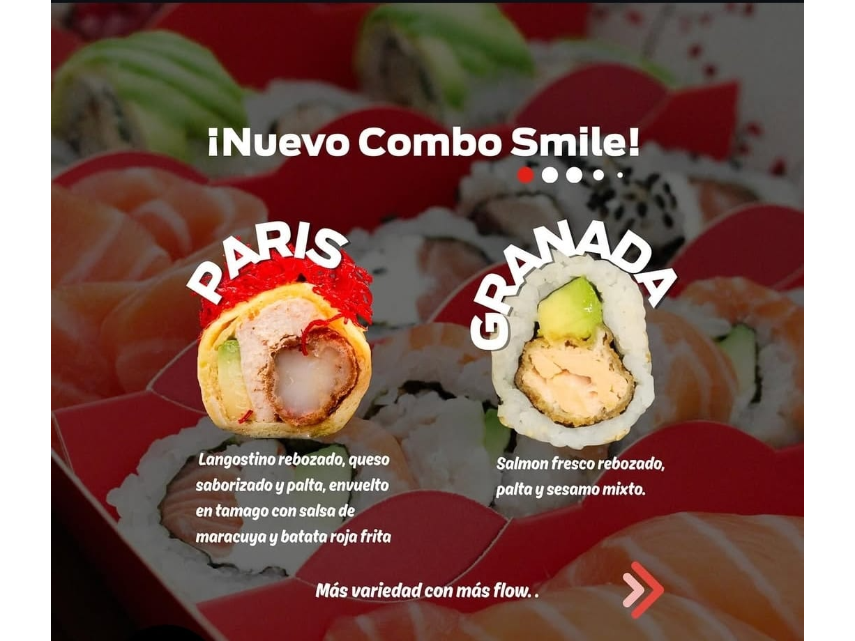 COMBO SMILE Compartir Combo cocido, con piezas de salmón, langostinos y kanikama. Incluye las siguientes variedades. - Boston - Futurama - Granada - Dragon - Paris *10% de descuento retirando y abonando en efectivo* Presentaciones Selecciona una opción.15 PIEZAS Incluye 3 piezas de cada variedad. *10% de descuento, retirando y abonando en efectivo* $15.50020 PIEZAS Incluye 4 piezas de cada variedad. *10% de descuento, retirando y abonando en efectivo* $21.50030 PIEZAS Incluye 6 piezas de cada variedad. *10% de descuento, retirando y abonando en efectivo* $27.900 Observaciones 0 / 150