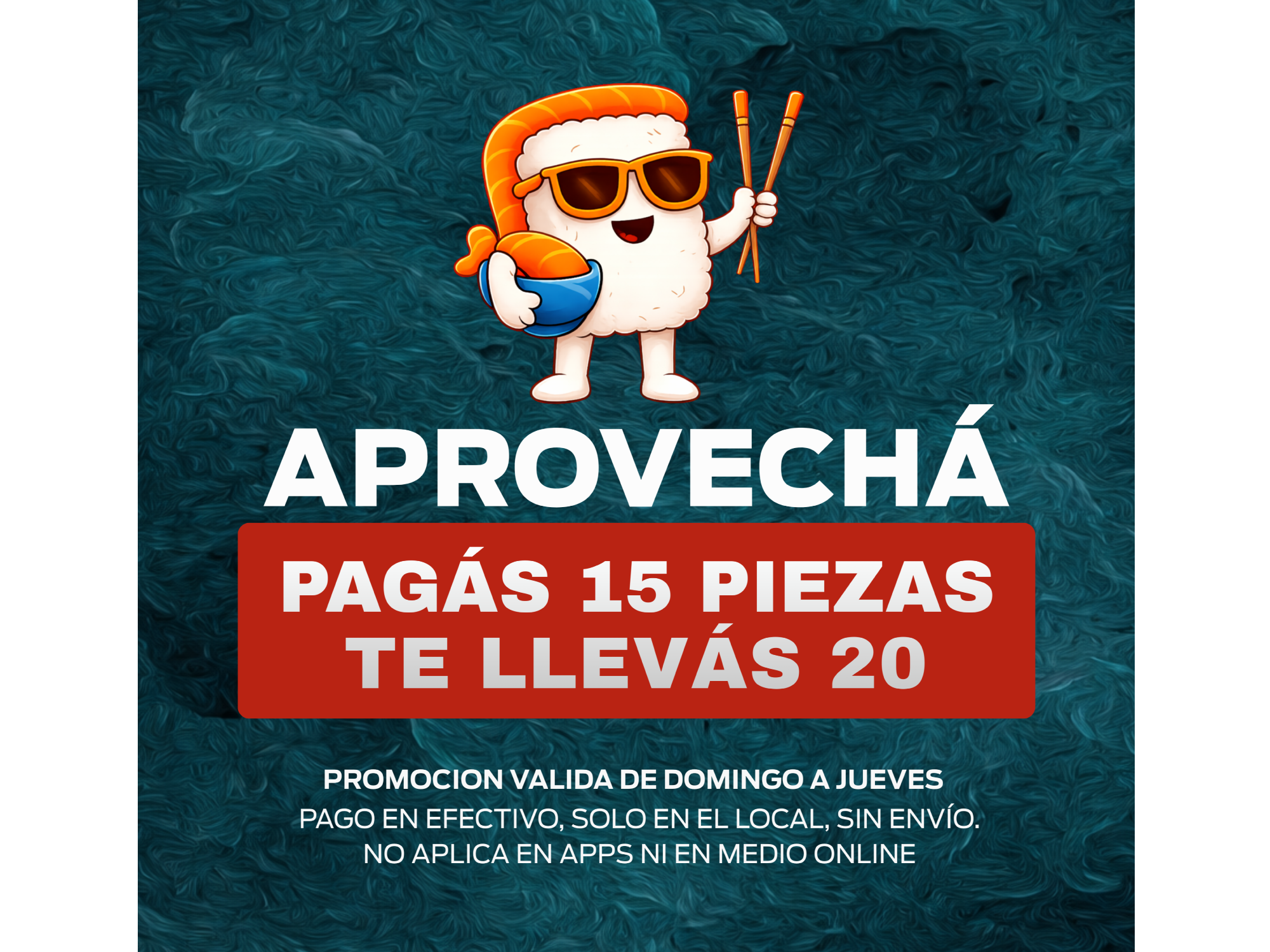 PROMOS DOMINGO A JUEVES Compartir por WhatsApp Copiar enlace PAGAS 15 PIEZAS, TE LLEVAS 20! desde $16.700 Hasta 23% OFF 24 PIEZAS CALIENTES 20% OFF $45.600$36.500 20% OFF ENSALADAS x 2 desde $22.000 Hasta 15% OFF