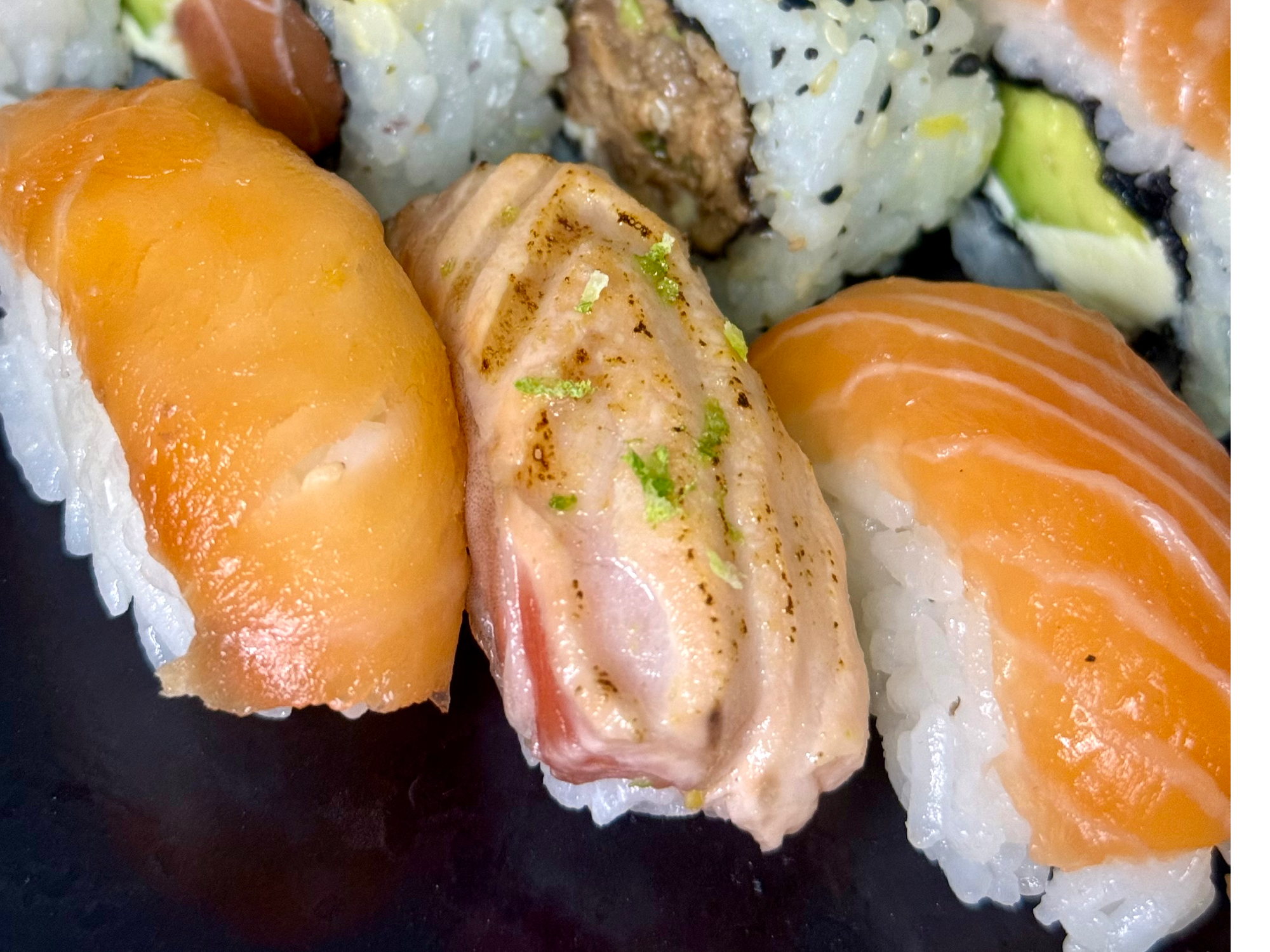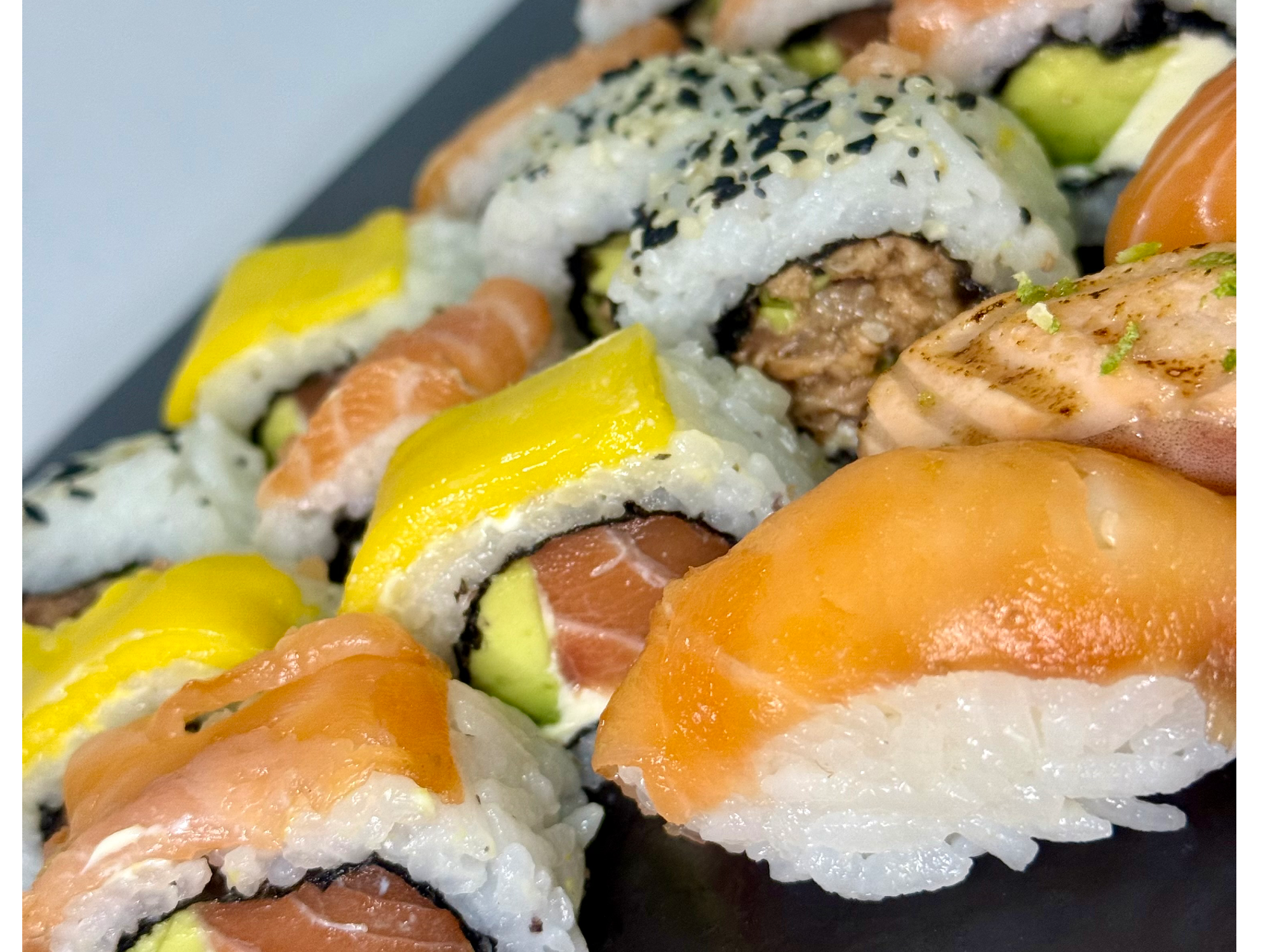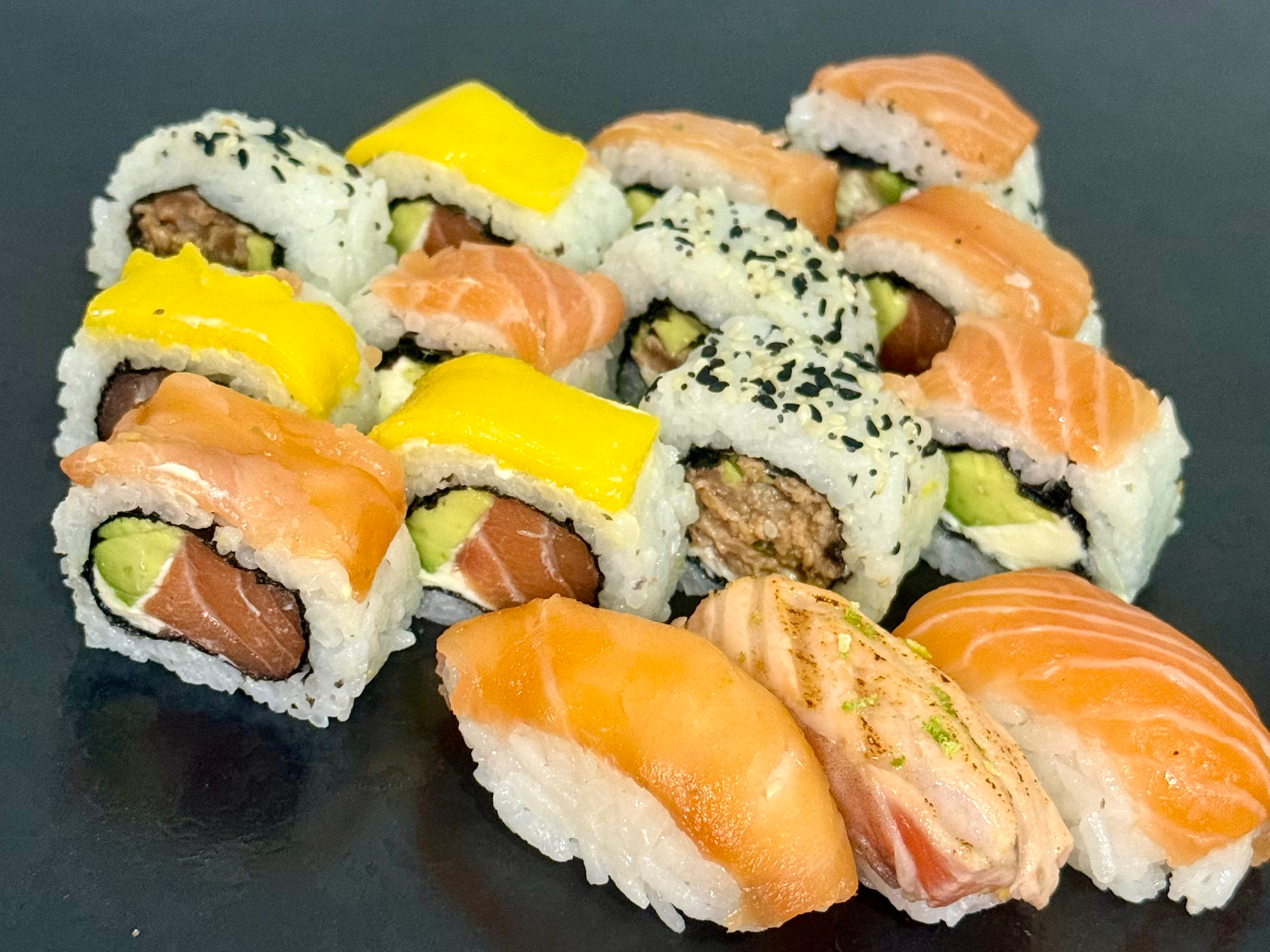 Friends-mix solo salmón premiumDos salmones, avocado, tropical, salmón tartar, Niguiri, Niguiri ahumado y Niguiri flambeado con rayadura de limón Presentaciones Seleccioná una opción.X15$25.000X30$42.000X40$48.000X50$53.000 Complementos para tu pedido Agregá items adicionales a tu pedido. Extras Seleccioná las opciones que quieras.Teriyaki Ahumada$800Salsa maracuyá$1.000Wasabi Observaciones 0 / 150