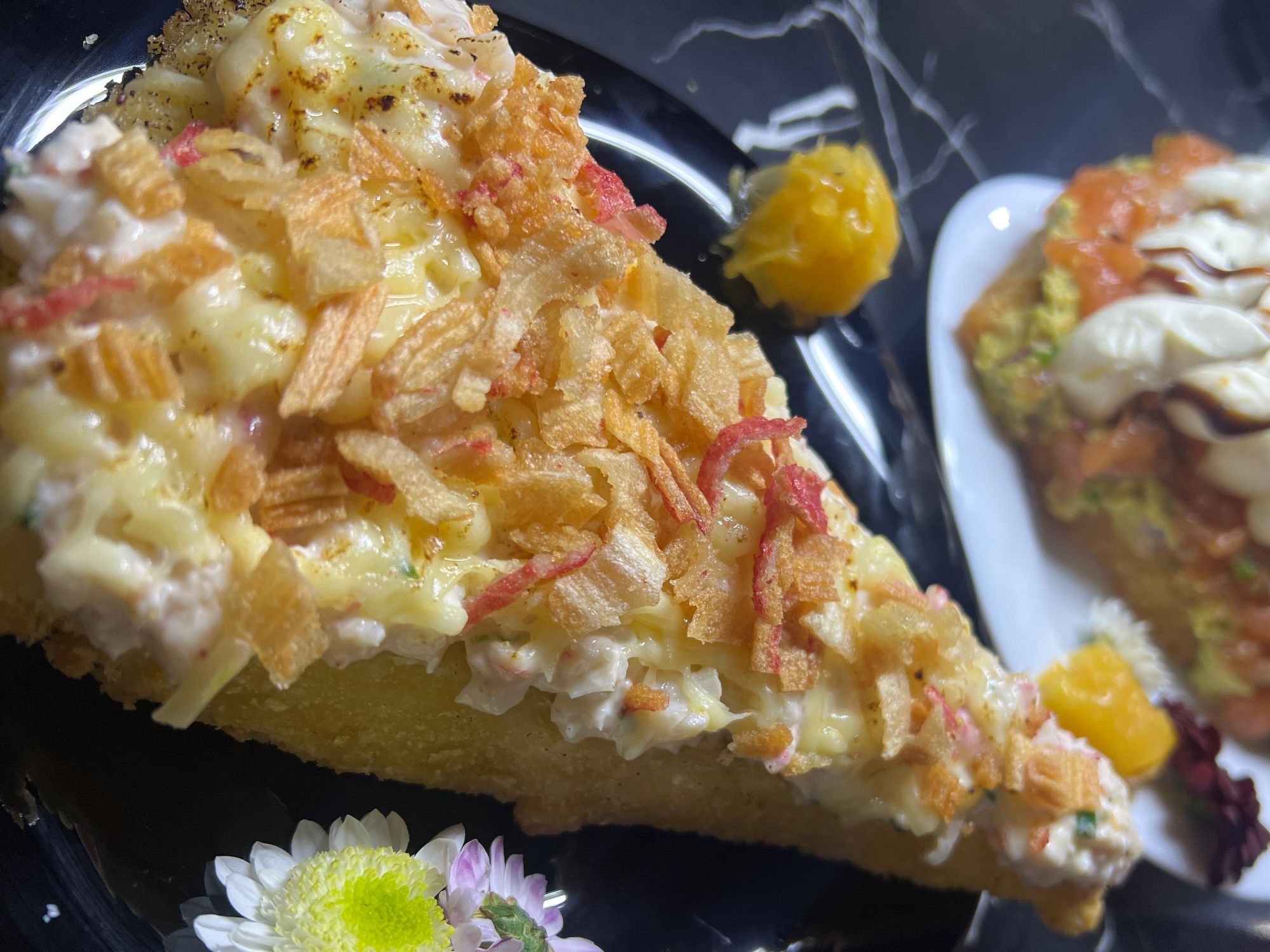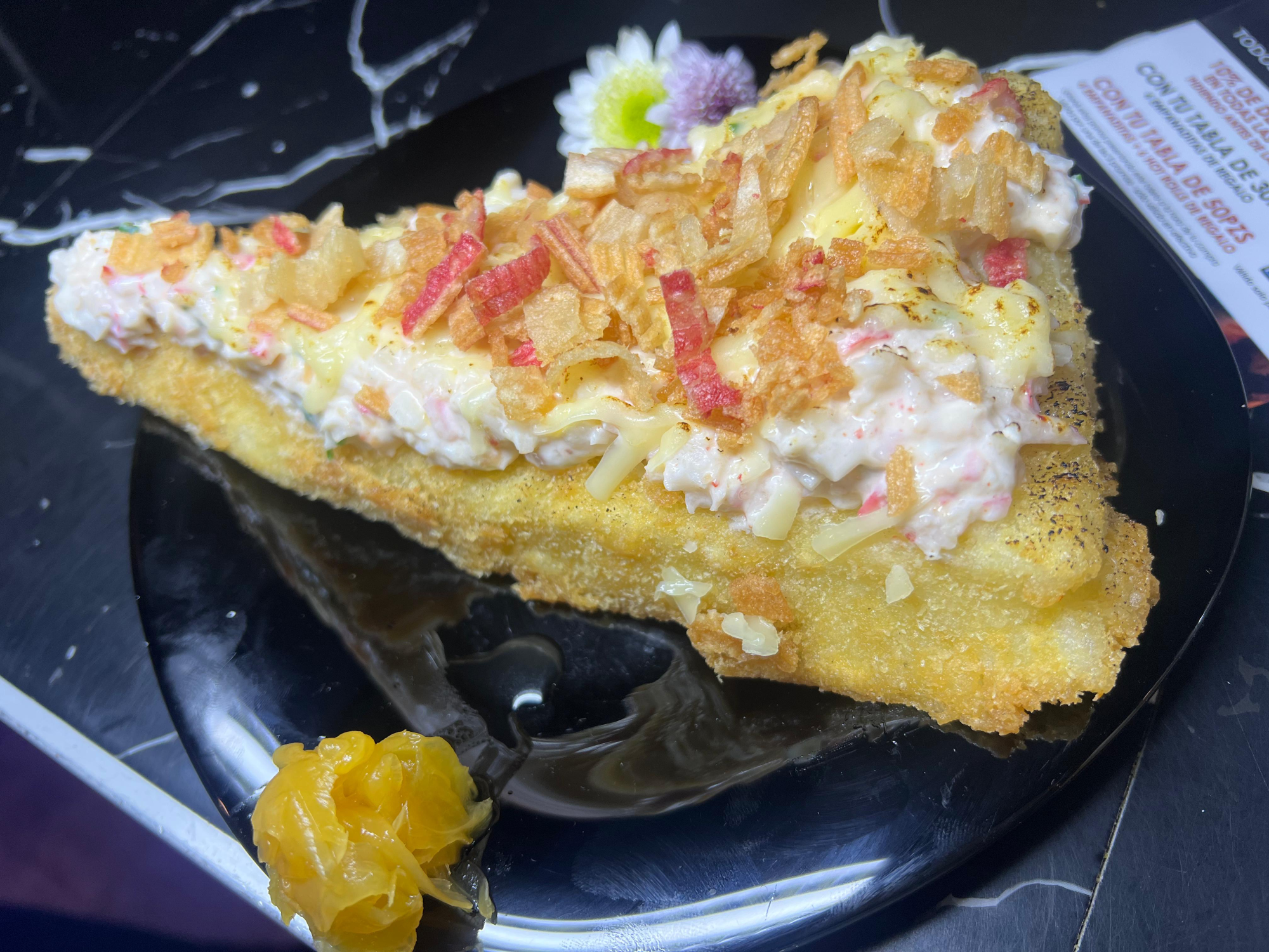 SUSHI PIZZA DE KANIKAMA Y LANGO Compartir Tartar de kanikama y langostino, parmesano flambeado y kanikama frito.$30.000 Observaciones 0 / 150