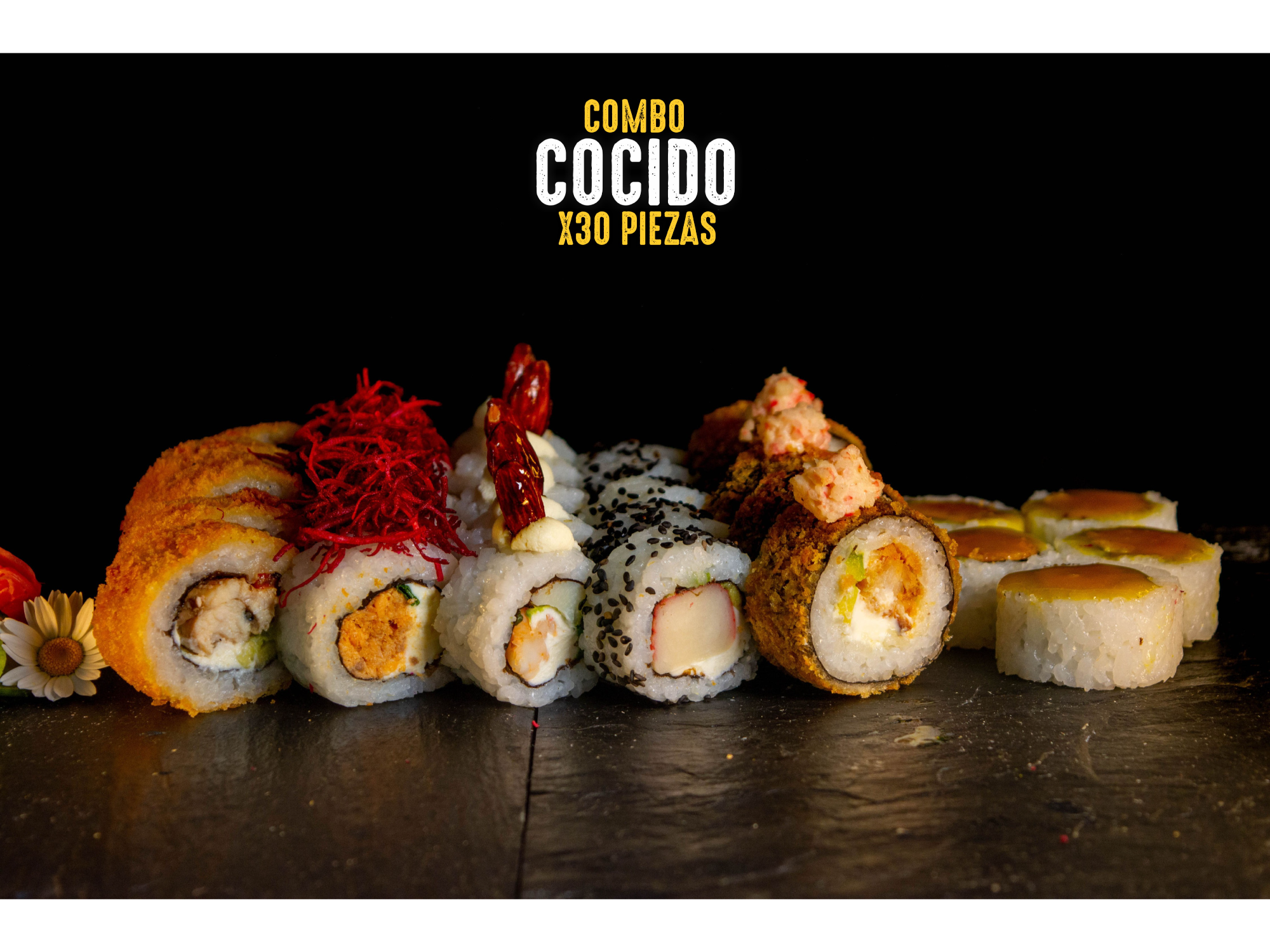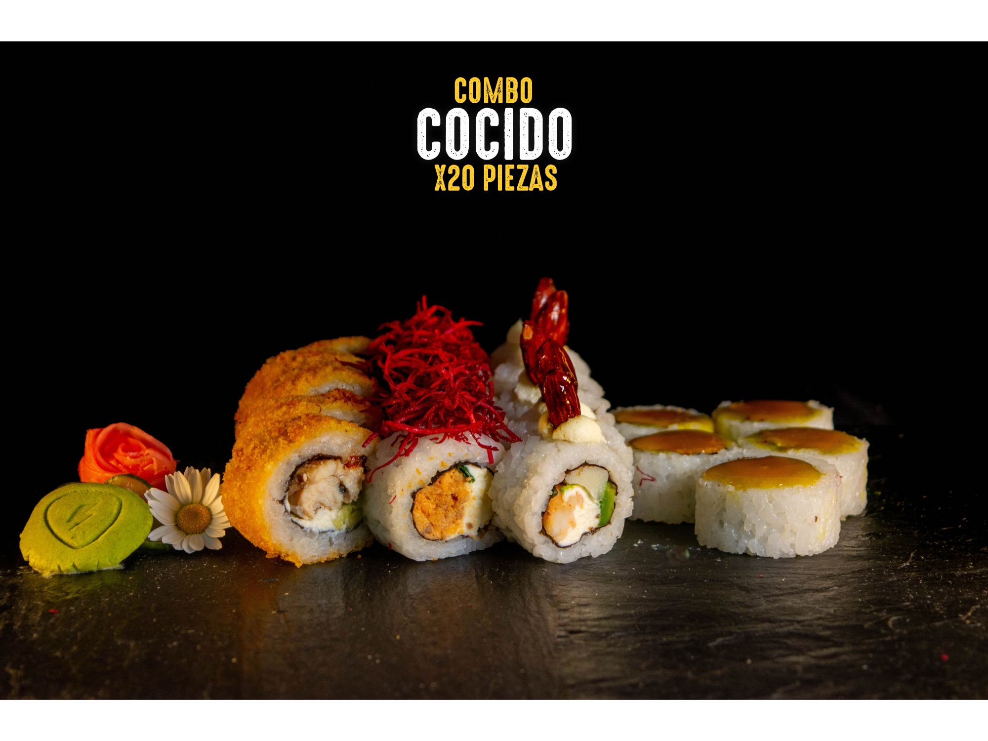 El combo cocido contiene piezas con langostinos, con pollo teriyaki y con salmon cocido. Es ideal para entrar en el mundo del sushi, ya que no tiene nada crudo.