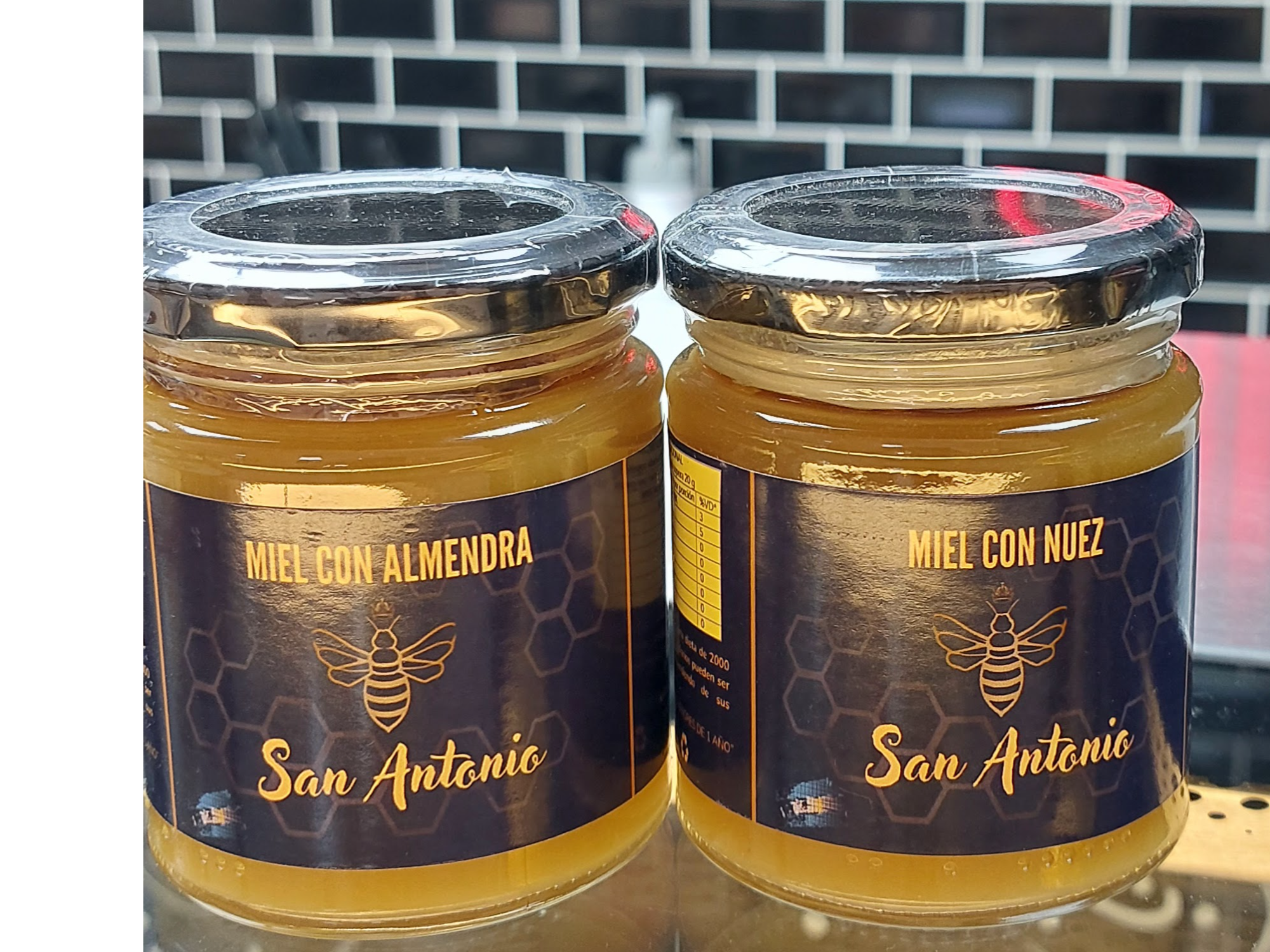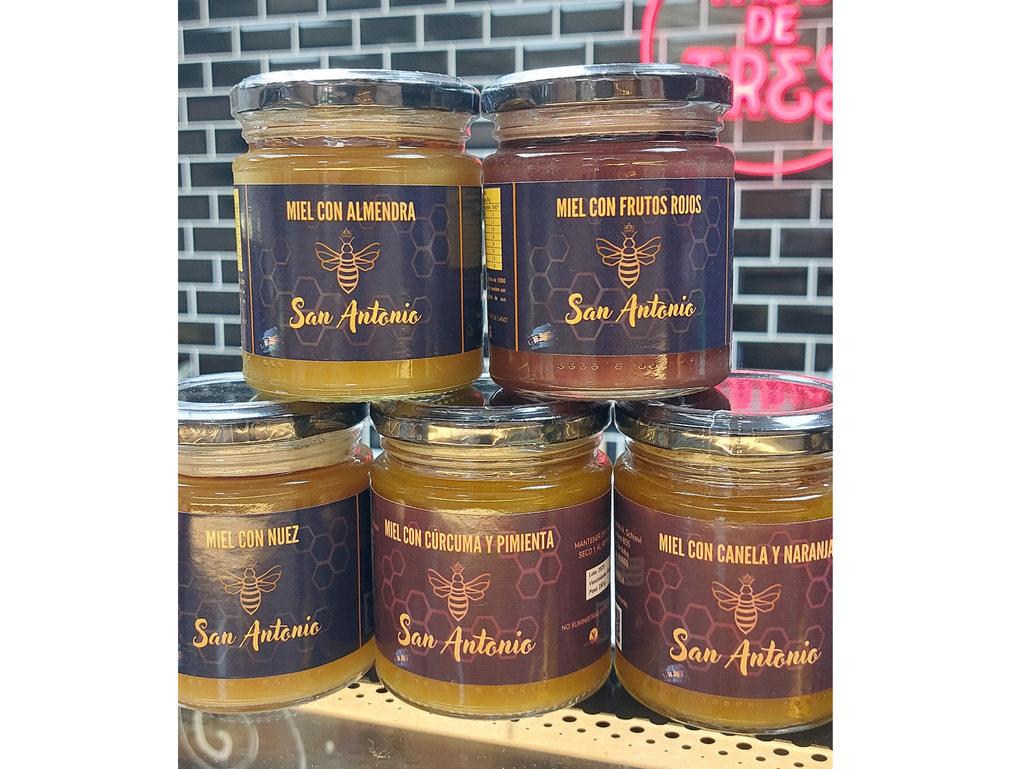 MIELES SAN ANTONIOLas mieles intervenidas San Antonio elevan la esencia pura del néctar con ingredientes seleccionados que aportan carácter y sofisticación. Una fusión armoniosa de sabores que convierte cada cucharada en una experiencia gourmet. Presentaciones Seleccioná una opción.MIEL CON AALMENDRA$5.800MIEL CON FRUTOS ROJOS$5.800MIEL CON EUCALIPTUS Y GENGIBRE Sin stock $5.800MIEL CON NUEZ$5.800MIEL CON CÚRCUMA Y PIMIENTA$5.800MIEL CON CANELA Y NARANJA$5.800 Observaciones 0 / 150