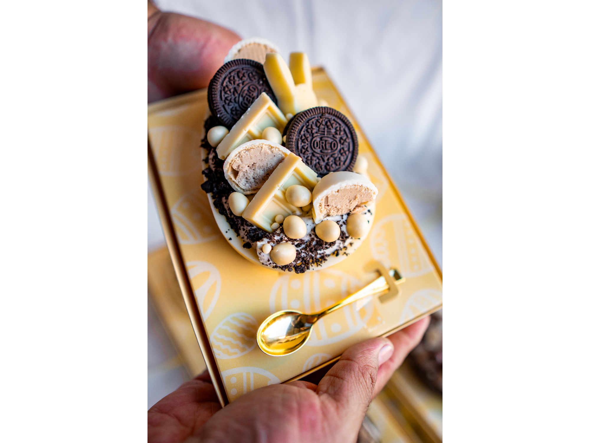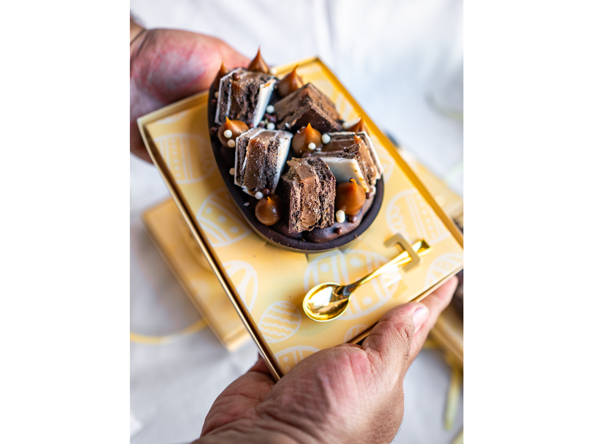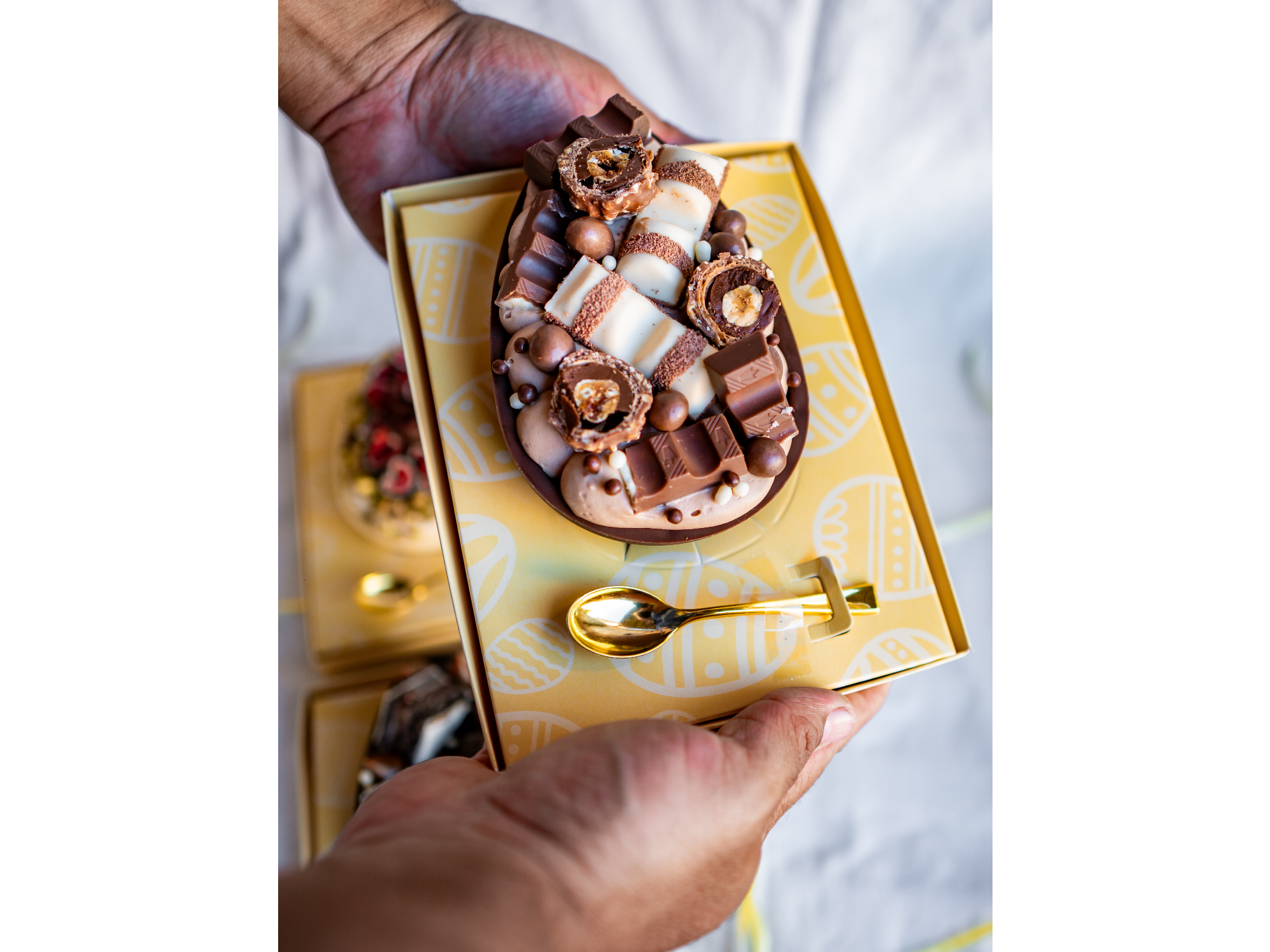 Chocolate semiamargo + dulce de leche, brownie, crema tipo Bariloche, Nutella, alfajor Rasta y cereales
