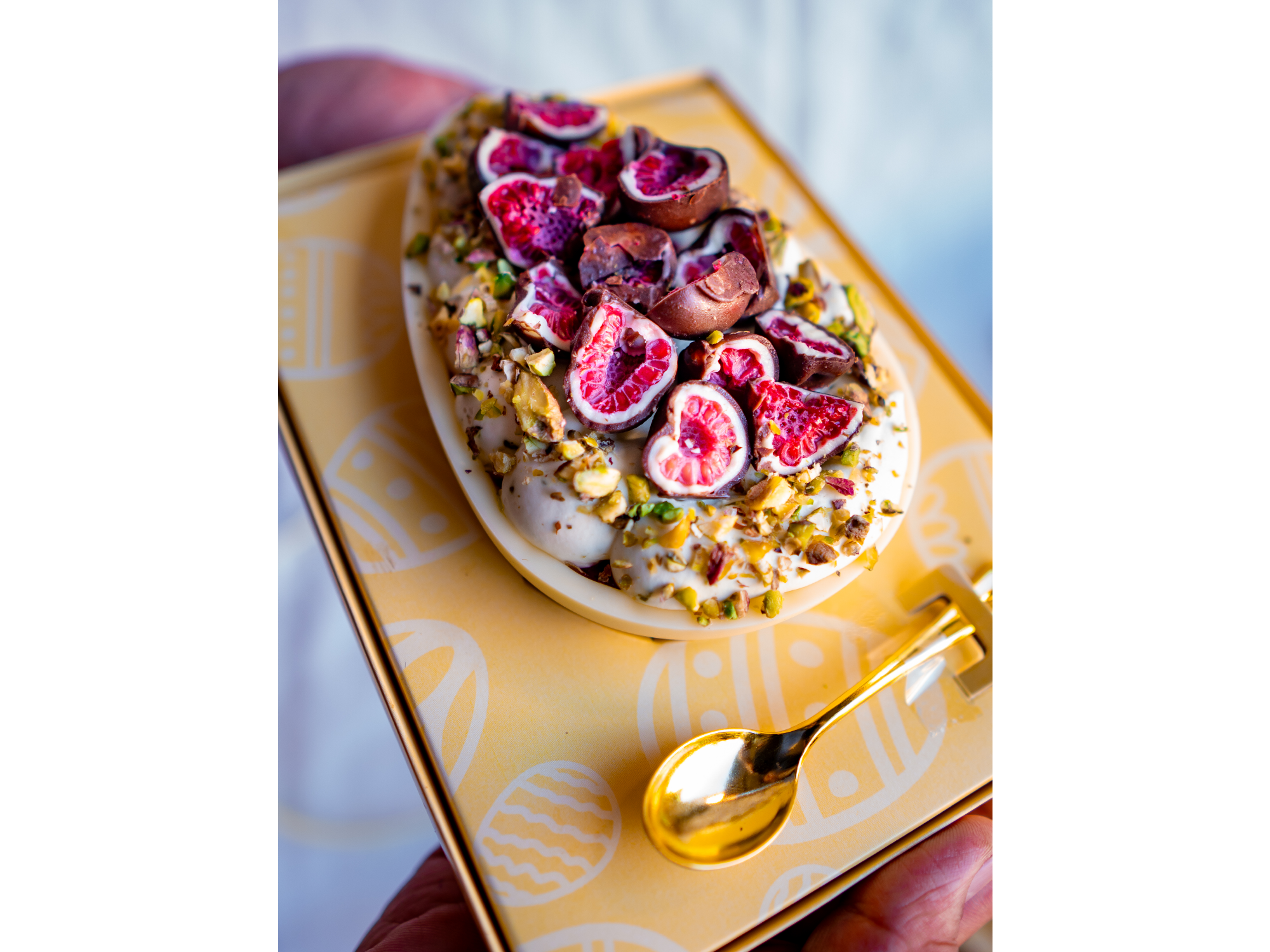 Chocolate blanco + pasta y crema de pistacho, blondie, frutos rojos, Franui y pistacho crocante.