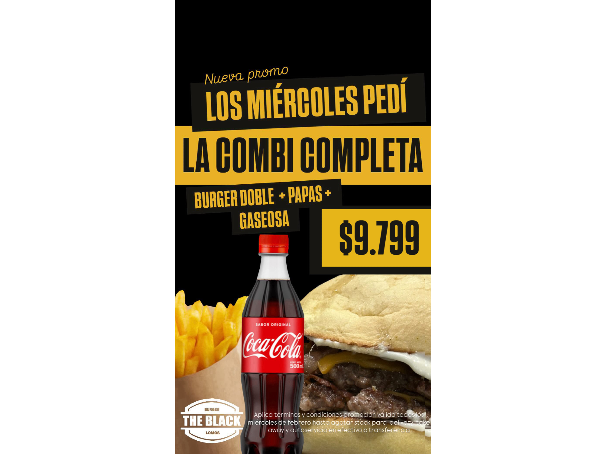 PROMO MIÉRCOLES Compartir por WhatsApp Copiar enlace Burger doble + papas + gaseosas 500ml $15.700$9.799 38% OFF