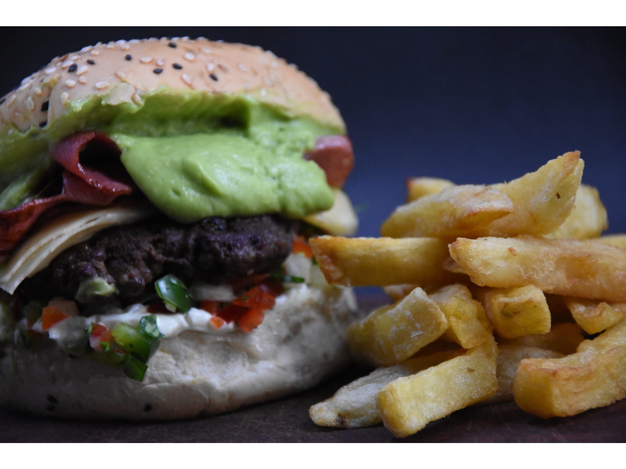Pan de papa, mayonesa, medallon de carne, queso emmenthal, salsa criolla, bacon y guacamole.