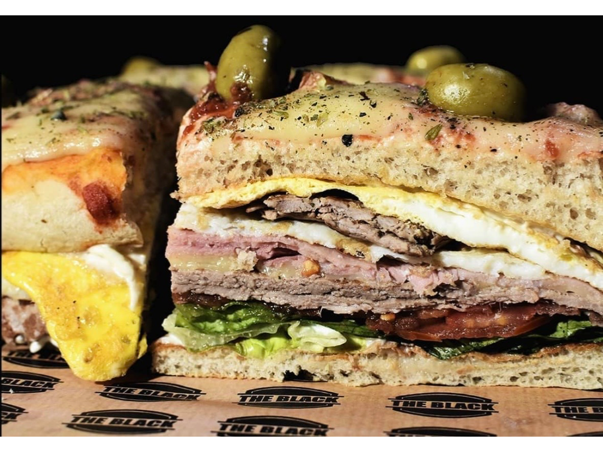 Masa de pizza, bife de lomo, mayonesa, lechuga, tomate, jamon, queso, huevo, salsa de tomate, mozzarella, orégano, aceitunas.