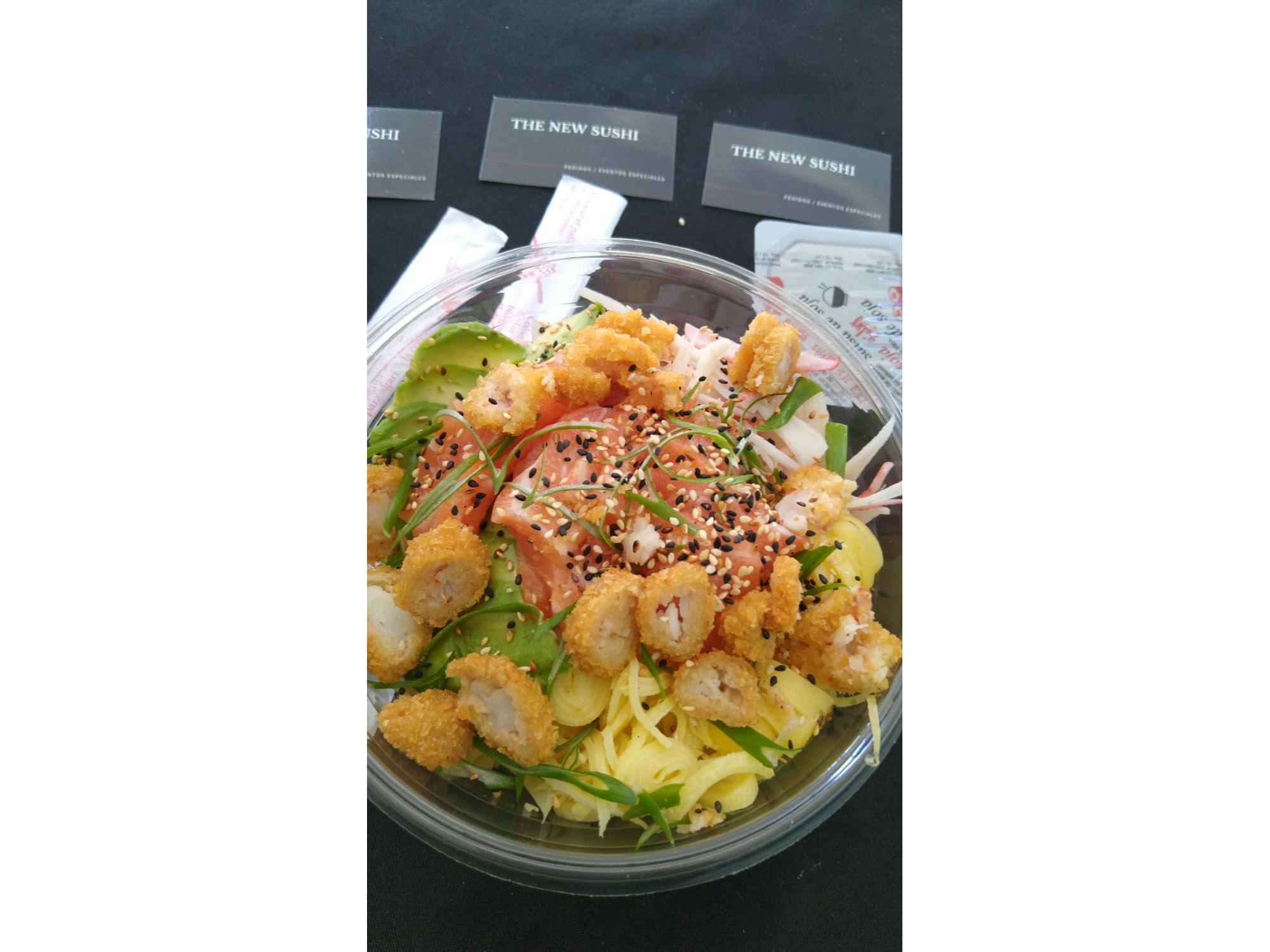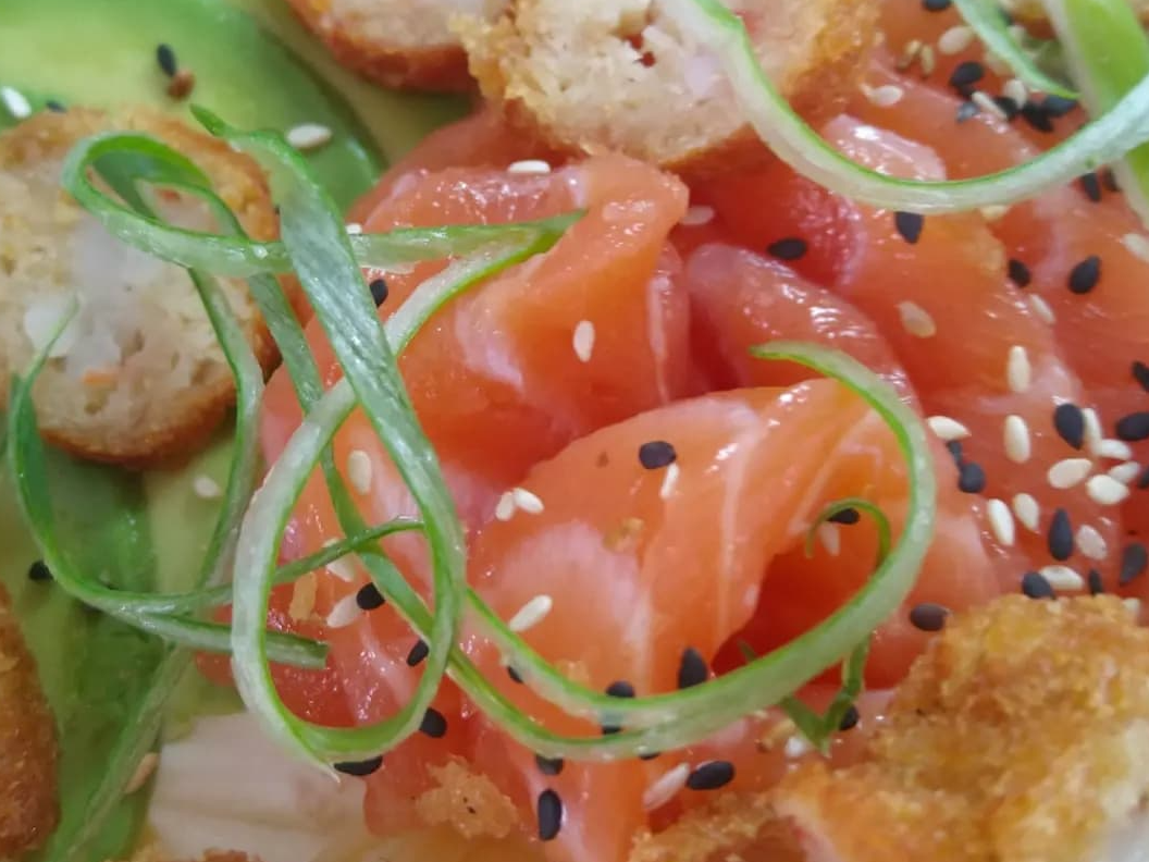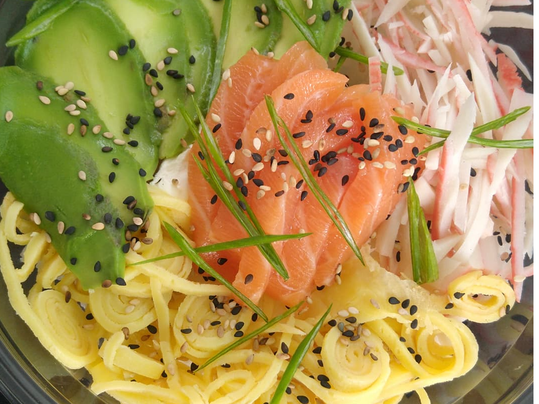 Gohan completa: arroz de sushi, salmón, kanikama,tamago,palta,queso crema, langostinos crispy y toppin de verdeo y sésamo mixto