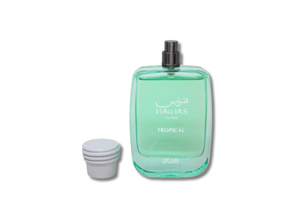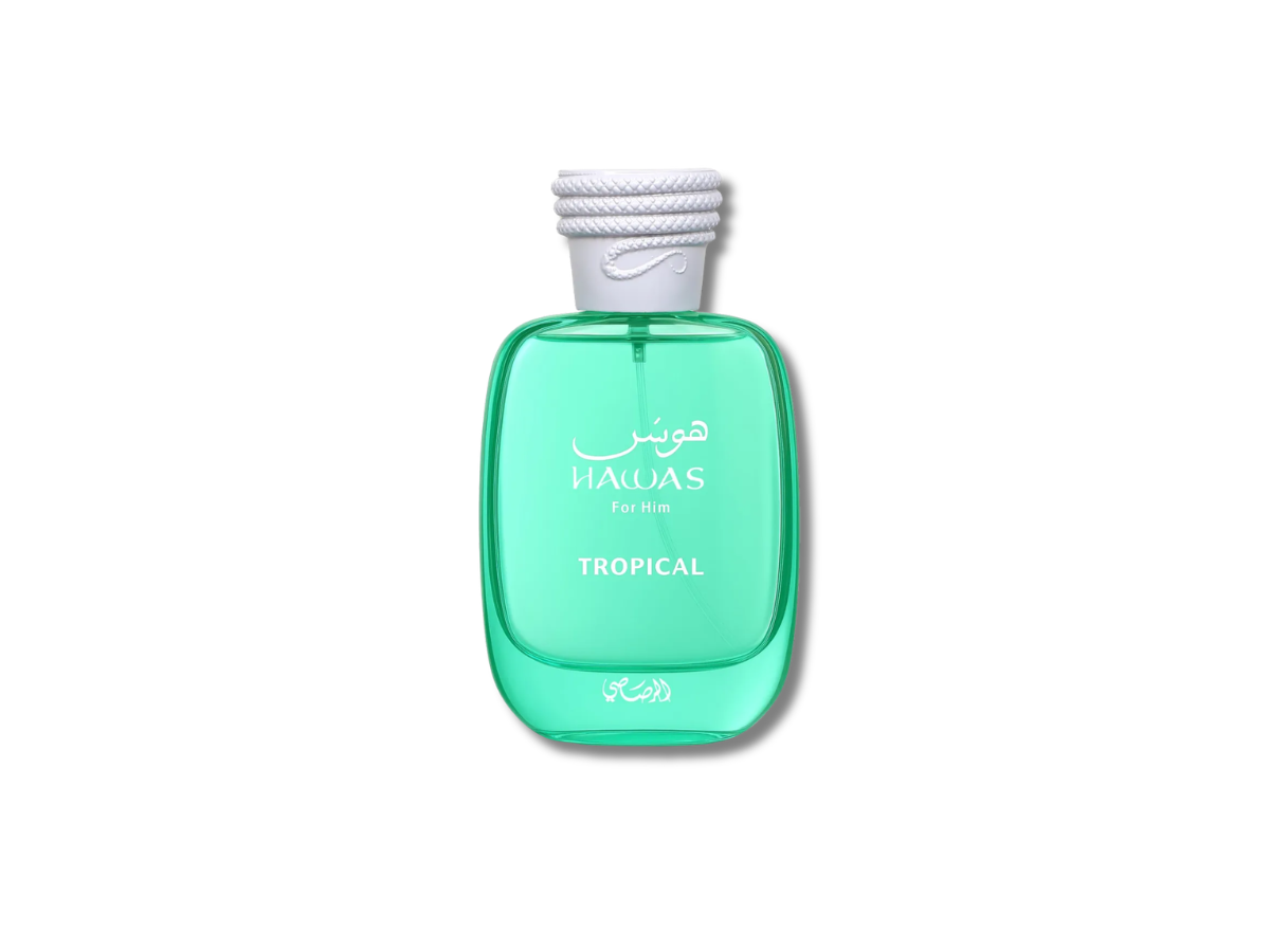 Hawas Tropical de Rasasi es una fragancia de la familia olfativa Aromática Verde para Hombres. Esta fragrancia es nueva. Hawas Tropical se lanzó en 2025. Las Notas de Salida son Agua de coco, hojas de higuera y jengibre; las Notas de Corazón son coco, higo y menta; las Notas de Fondo son sándalo, haba tonka y almizcle.