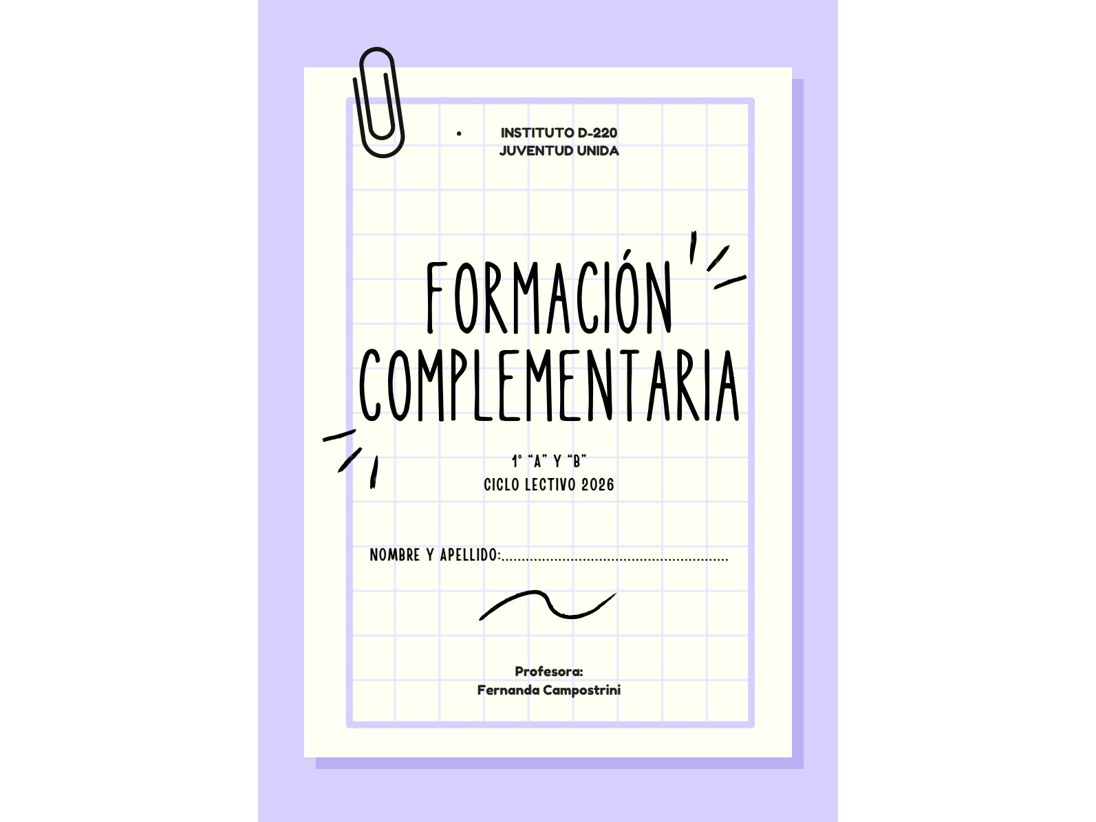 Formación Complementaria - 1° AÑO - ABDossier de Formación Complementaria - 1° AÑO "A y B" (Prof. Fernanda Campostrini) Presentaciones Seleccioná las opciones que quieras.COLOR Dossier impreso a COLOR $5.900NEGRO Dossier impreso en NEGRO $3.800 Observaciones 0 / 150