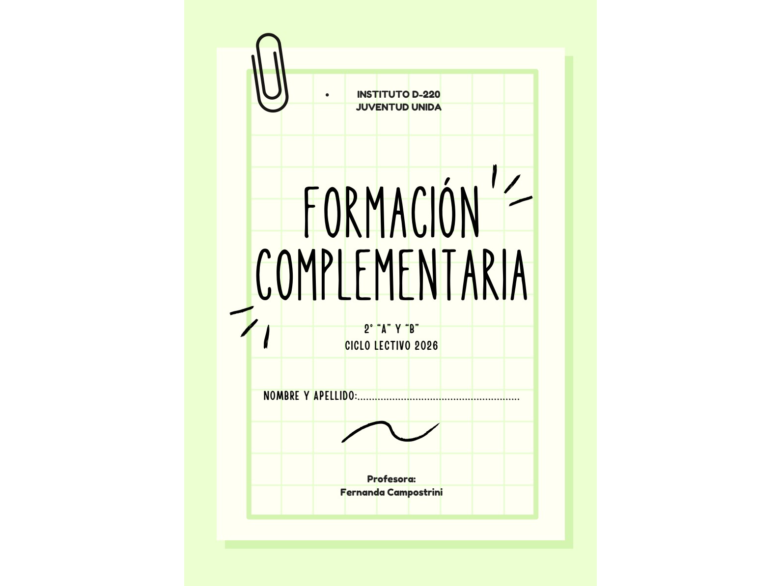 Formación Complementaria - 2° AÑO - ADossier de Formación Complementaria - 2° AÑO "A y B" (Prof. Fernanda Campostrini) Presentaciones Seleccioná las opciones que quieras.COLOR Dossier impreso a COLOR $5.900NEGRO Dossier impreso en NEGRO $3.800 Observaciones 0 / 150