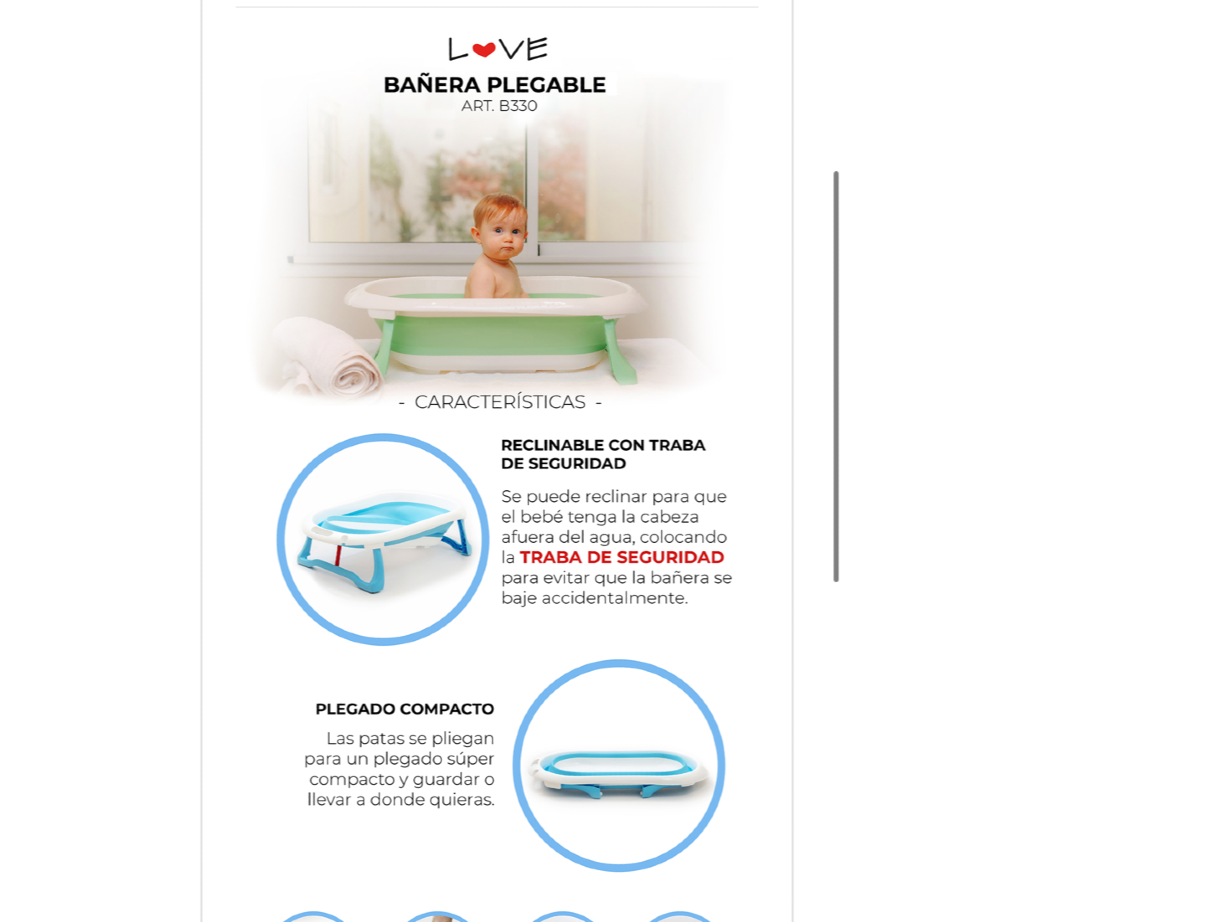 Bañeras plegables Love Compartir por WhatsApp Copiar enlace Bañera Plegable ultra compacta. • Reclinado con traba de seguridad. • Manija para colgar o llevar. • Tapón de drenaje y patas antideslizantes. • Encastre para duchador de mano. Presentaciones Seleccioná una opción.Color verde Sin stock $38.000Color verde$38.000Color rosa Sin stock $38.000 Observaciones 0 / 150