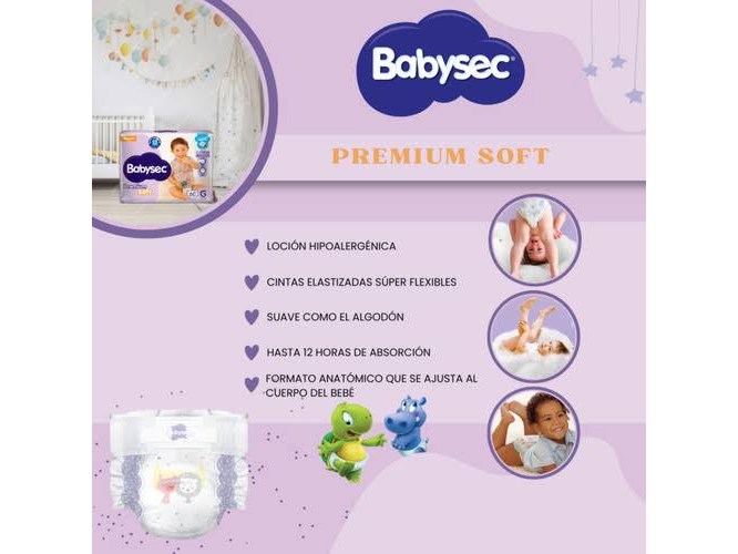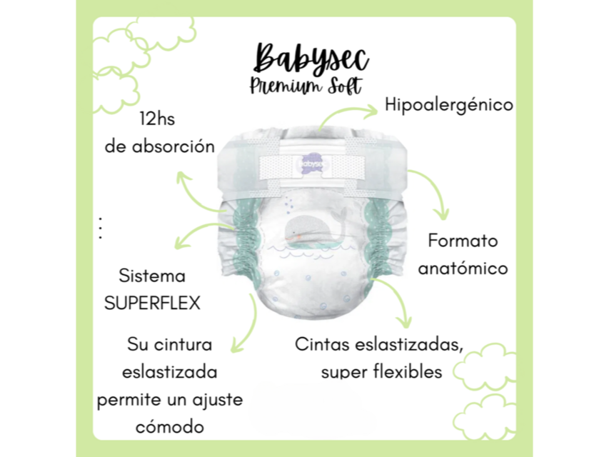 Babysec Premium Soft es un pañal hipoalergénico con cubierta de algodón que ofrece hasta 12 horas de absorción, manteniendo la piel del bebé seca. Sus principales características incluyen una cintura y cintas elásticas para un ajuste cómodo y seguro, barreras reforzadas contra derrames, un formato anatómico para mayor libertad de movimiento y tecnología de gel superabsorbente para evitar filtraciones. Características principales Máxima absorción: Proporciona hasta 12 horas de protección, manteniendo la piel seca durante la noche. Tecnología absorbente: Cuenta con gel superabsorbente para una mayor sequedad. Cuidado de la piel: Su cubierta suave con extracto de algodón está diseñada para proteger la piel sensible y prevenir posibles alergias. Es hipoalergénico y libre de parabenos. Ajuste y comodidad: La cintura elastizada, las cintas elásticas y el formato anatómico se adaptan al cuerpo del bebé, ofreciendo un ajuste cómodo y seguro, además de mayor libertad de movimiento. Protección contra derrames: Incluye barreras reforzadas que evitan las filtraciones por la espalda y los lados.