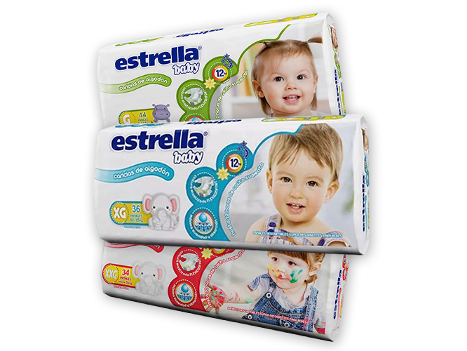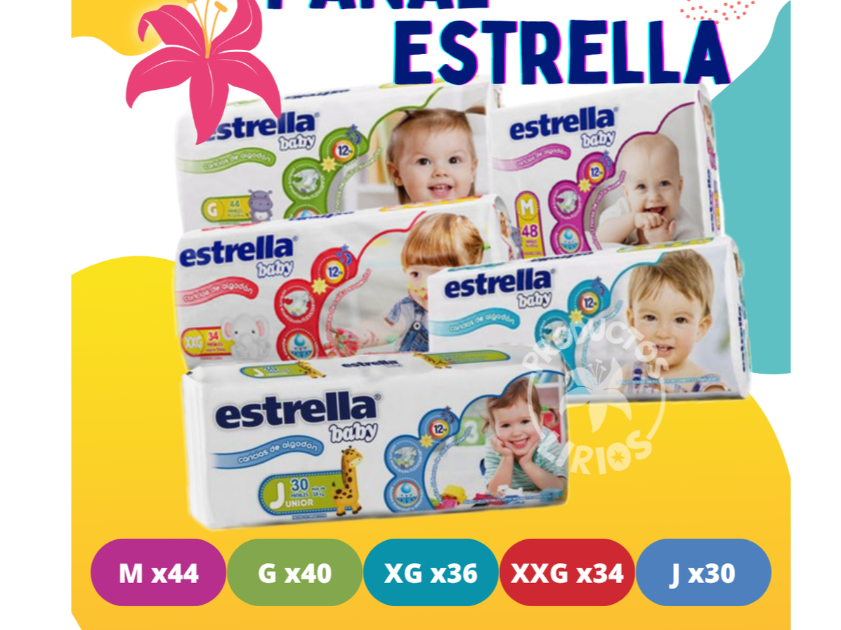 Los pañales Estrella Baby "Hiperpack" tienen diferentes tallas según el peso del bebé: talla M (6 kg a 9.5 kg, 48 unidades), talla G (9 kg a 12.5 kg, 44 unidades), talla XG (12 kg a 15 kg, 36 unidades) y talla XXG (más de 14 kg, 34 unidades). Estos pañales se caracterizan por su capa absorbente, y por ser hipoalergénicos y libres de látex y parabenos.