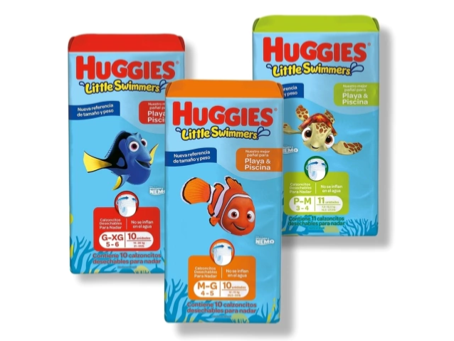 Funcionamiento: A diferencia de los pañales normales que se hinchan y pesan en el agua, los Huggies® Little Swimmers® están hechos de un material único que no absorbe agua, permitiendo que el bebé se mueva cómodamente.