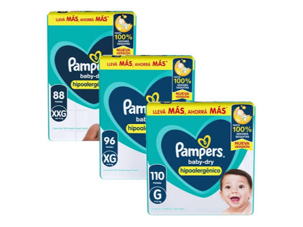La descripción general del producto incluye máxima absorción, con hasta 12 horas de sequedad gracias a su tecnología de gel superabsorbente y canales de aire. También se destacan sus barreras anti-derrames reforzadas, un ajuste cómodo gracias a las cintas y cintura elastizadas, y una cubierta suave e hipoalergénica con loción que protege la piel del bebé.
