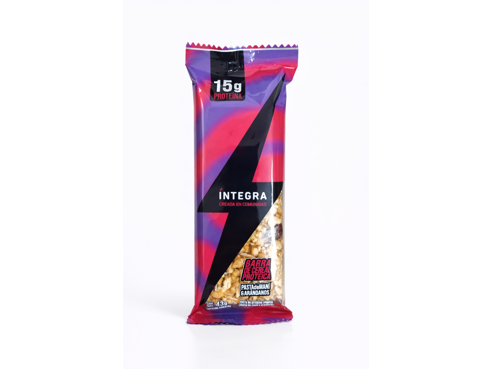 Barra proteica con 15 g de proteína por unidad, un snack práctico, nutritivo y energético. Elaborada con pasta de maní y arándanos, combina sabor intenso con una textura crocante y natural.