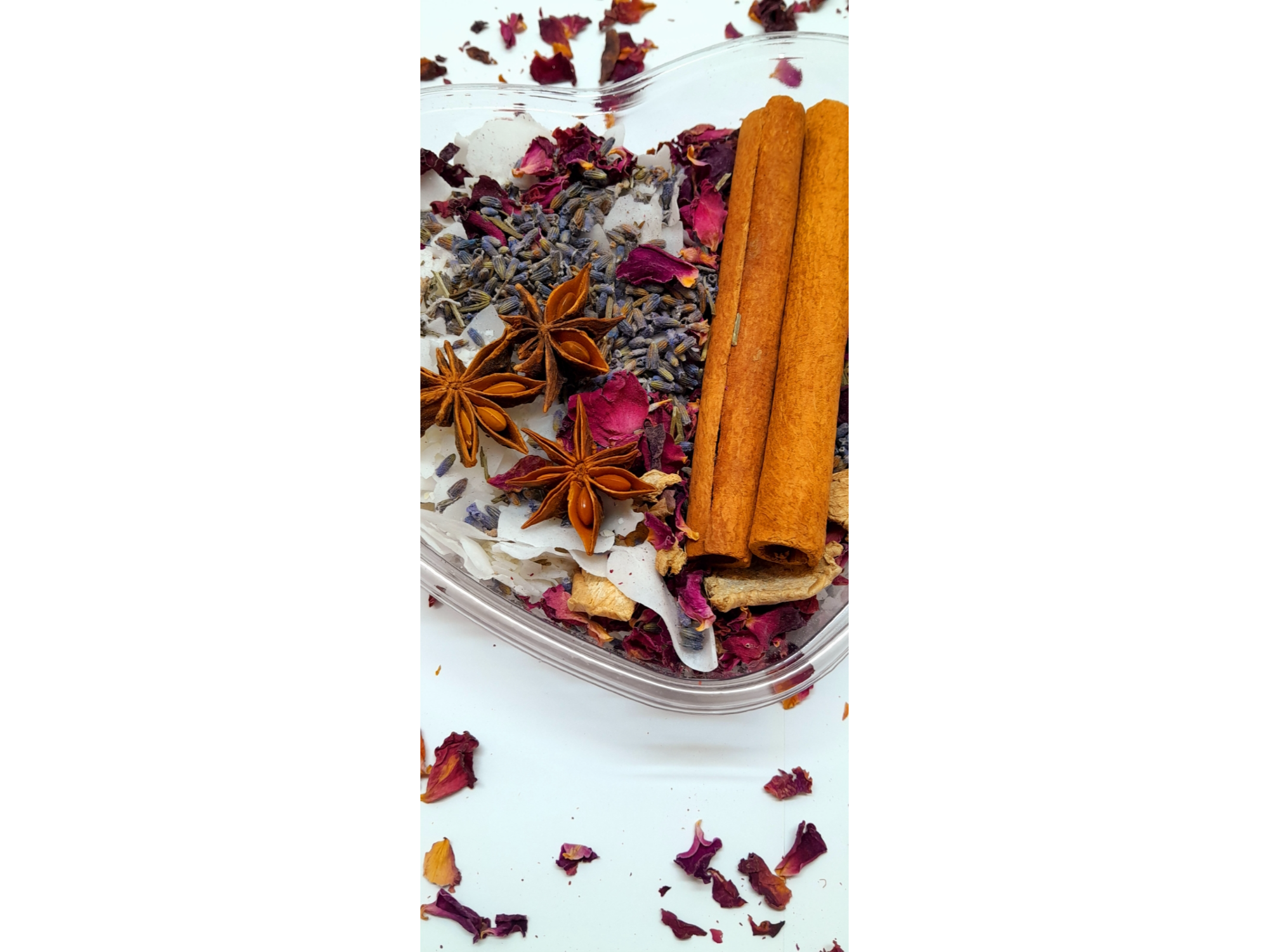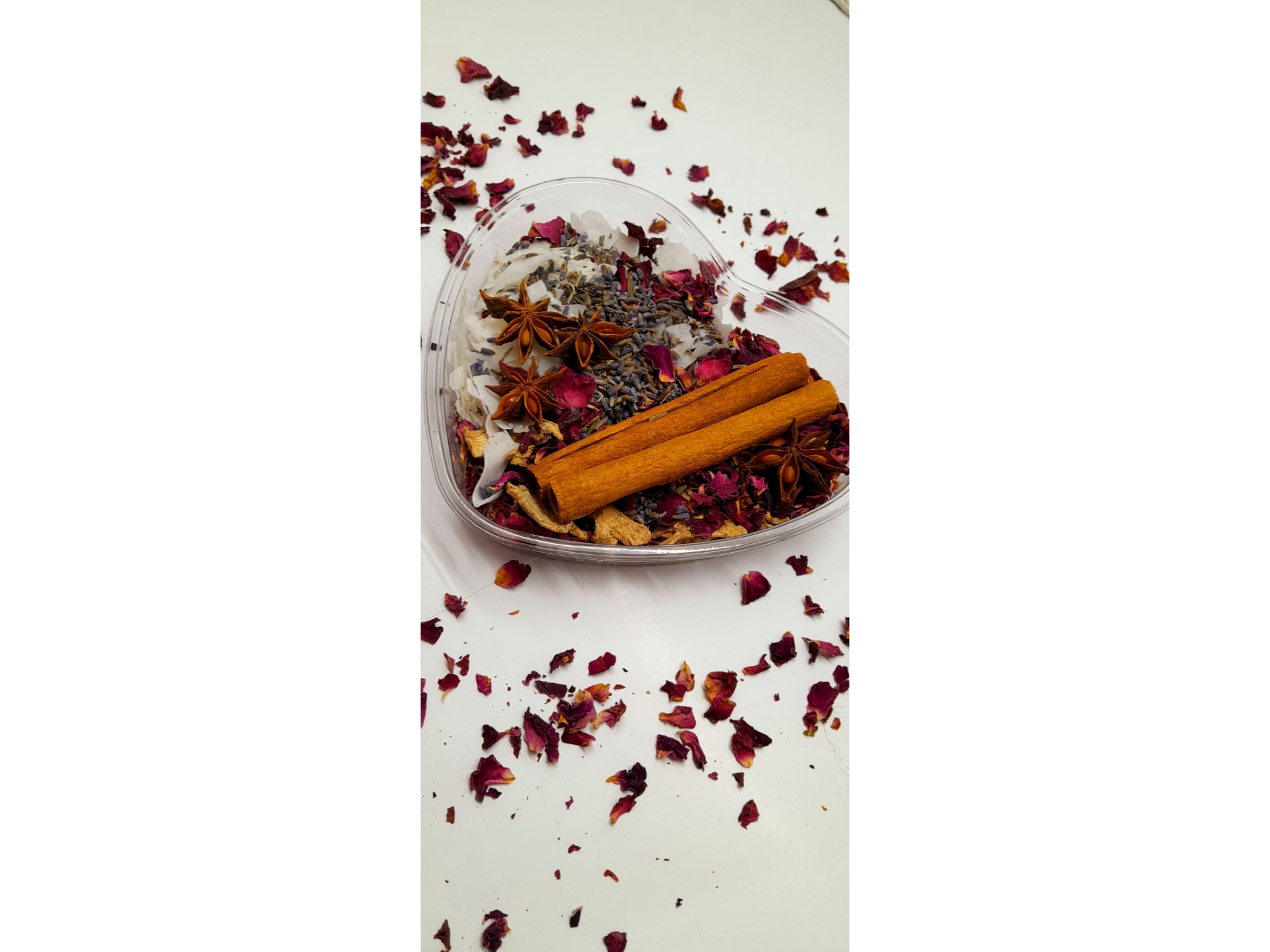 Corazón Primavera 💐Contiene: Coco en Escamas/ Jengibre/ Pétalos de Rosa/ Lavanda/ Canela en Rama/ Anís estrellado$4.100 Observaciones 0 / 150