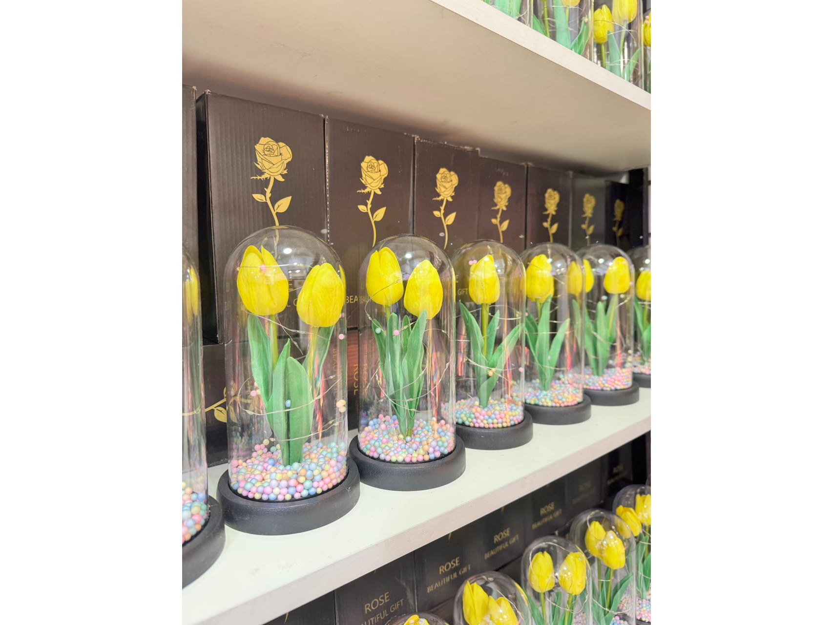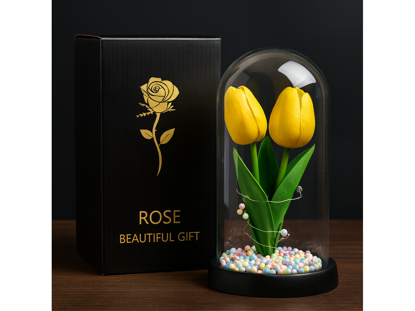Delicada y elegante, esta cúpula decorativa contiene tulipanes artificiales iluminados con luces LED cálidas. Ideal para regalar o decorar cualquier espacio.