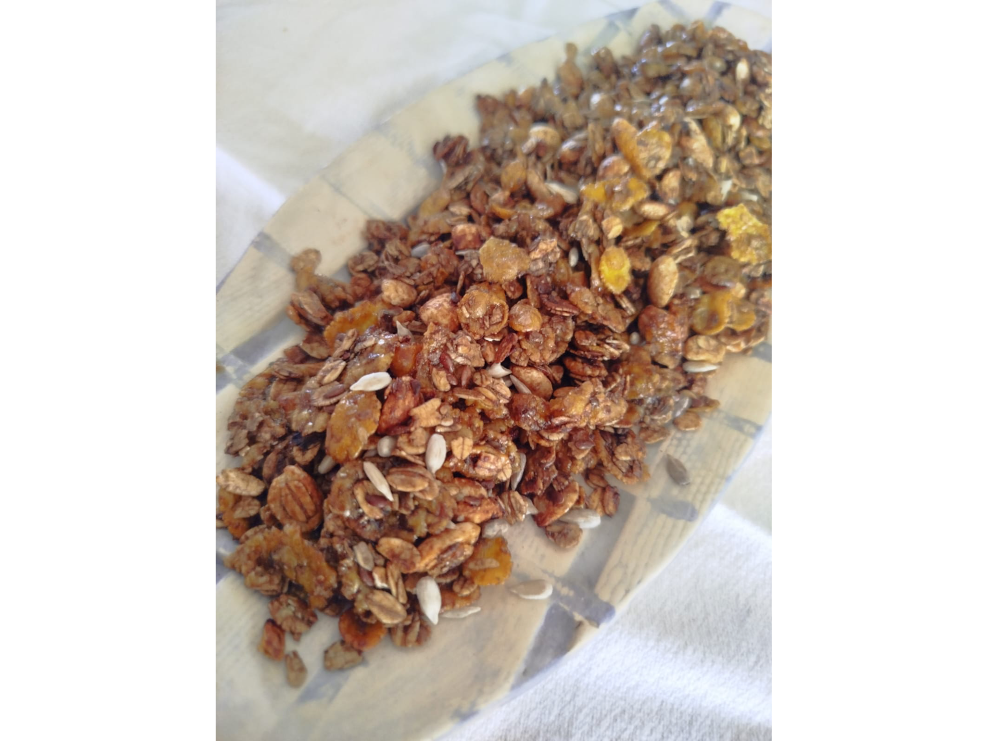 Avena tradicional, copos de maiz sin azúcar, proteina texturizada de soja, mani tostado, girasol pelado, pasas de uva sin semilla, azúcar mascabo, miel, lino, arroz entero inflado, salvado de trigo, sésamo integral, chia, canela en polvo.
