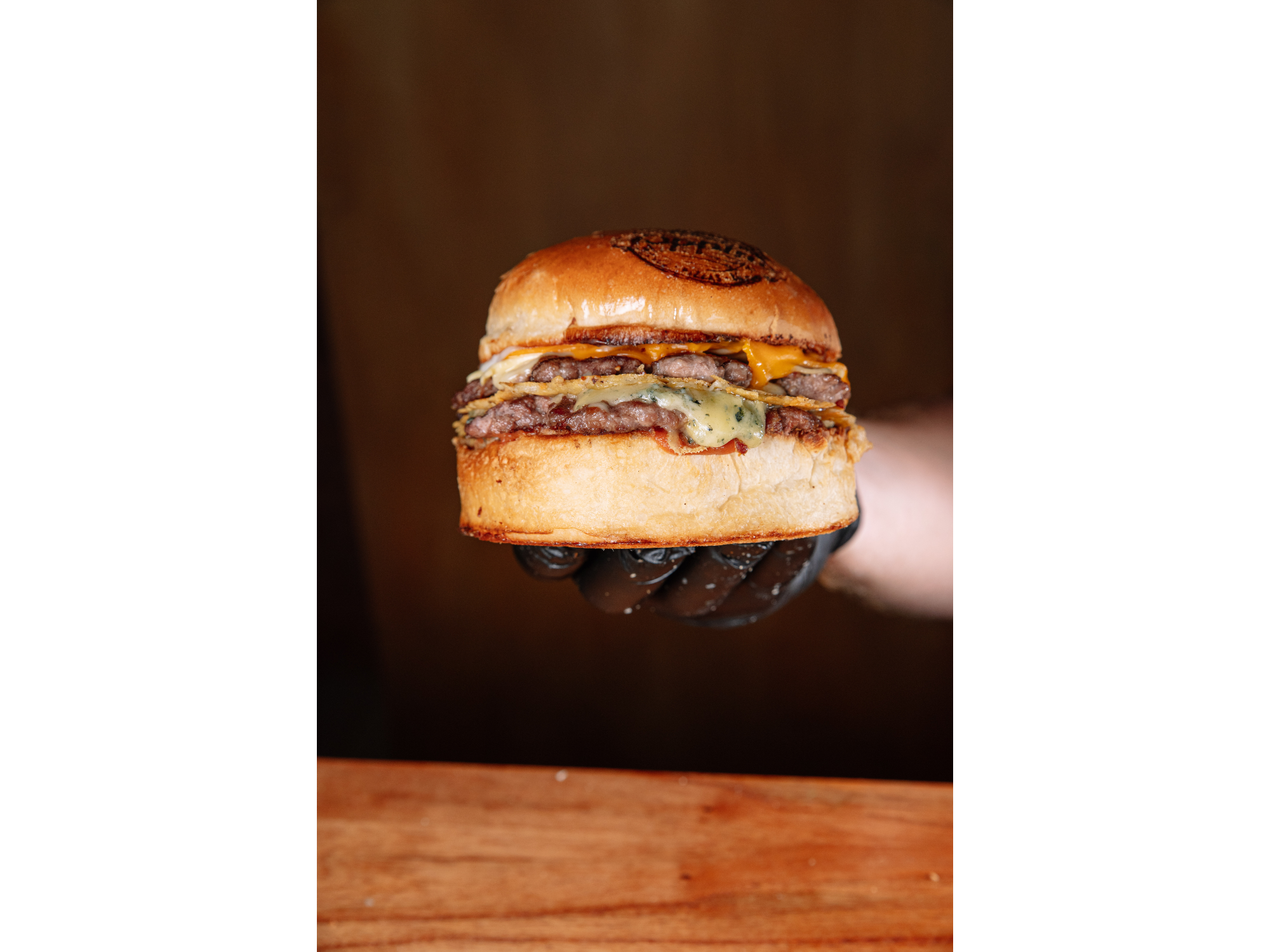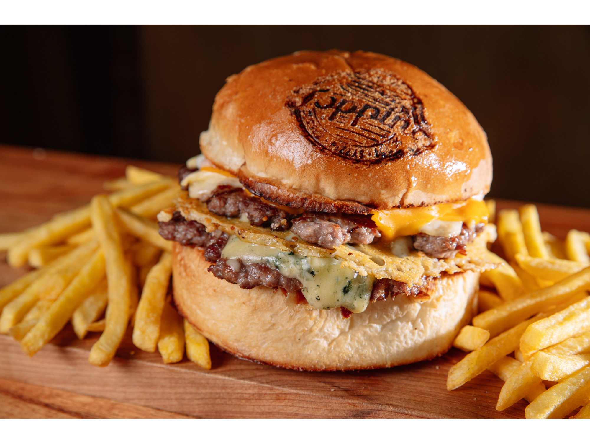 PAN DE PAPA, QUESO CHEDDAR, QUESO TYBO, ROQUEFORT, PROVOLONE A LA PLANCHA, BLEND DE 120GRS C/U, SALSA CUARTO ACOMPAÑADA DE PAPAS
