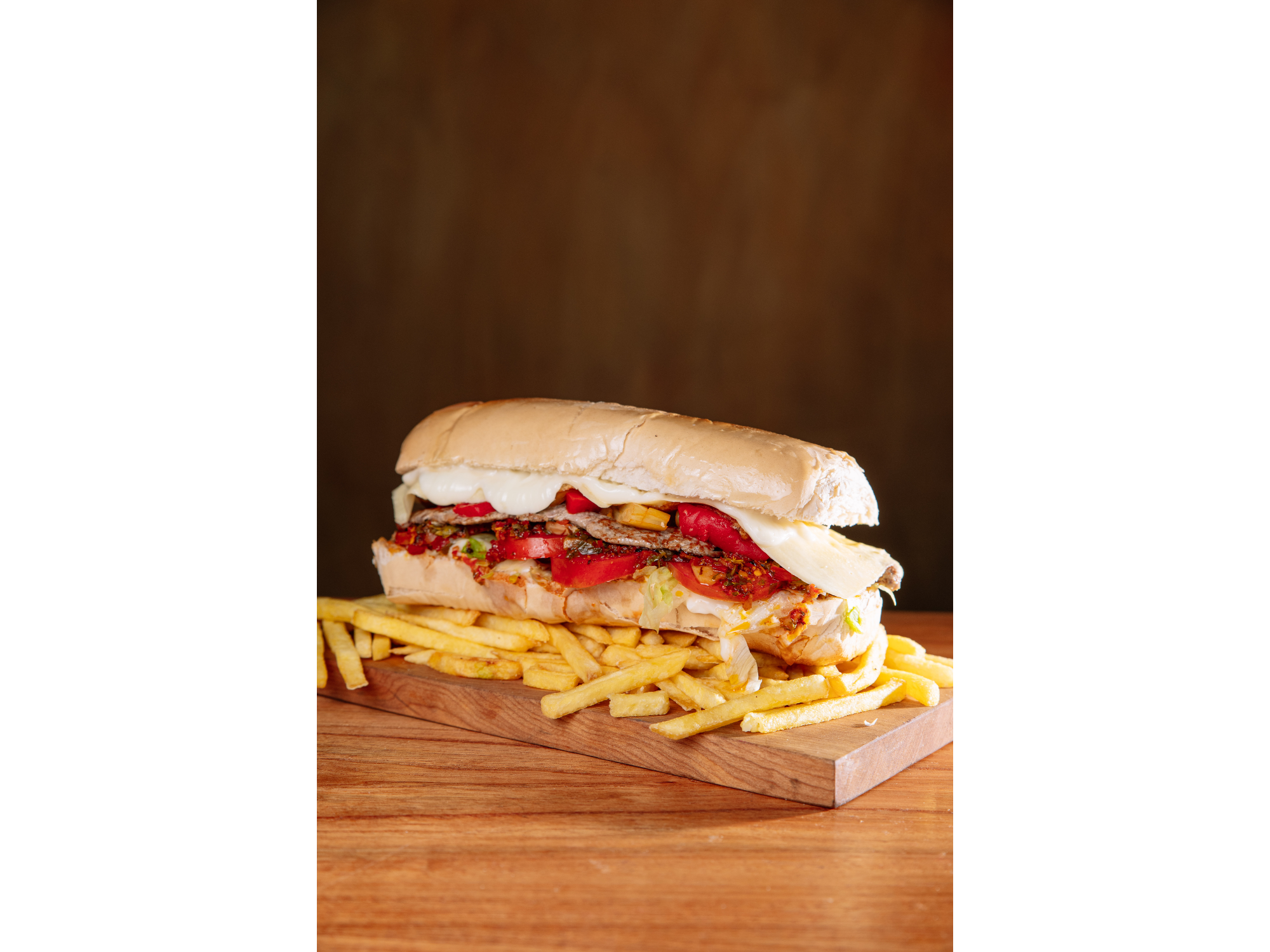 PAN DE LOMO, BIFE DE LOMO 125grs, QUESO, HUEVO, MORRONES Y AJI, LECHUGA, TOMATE , CHIMI, MAYONESA ACOMPAÑADO DE PAPAS