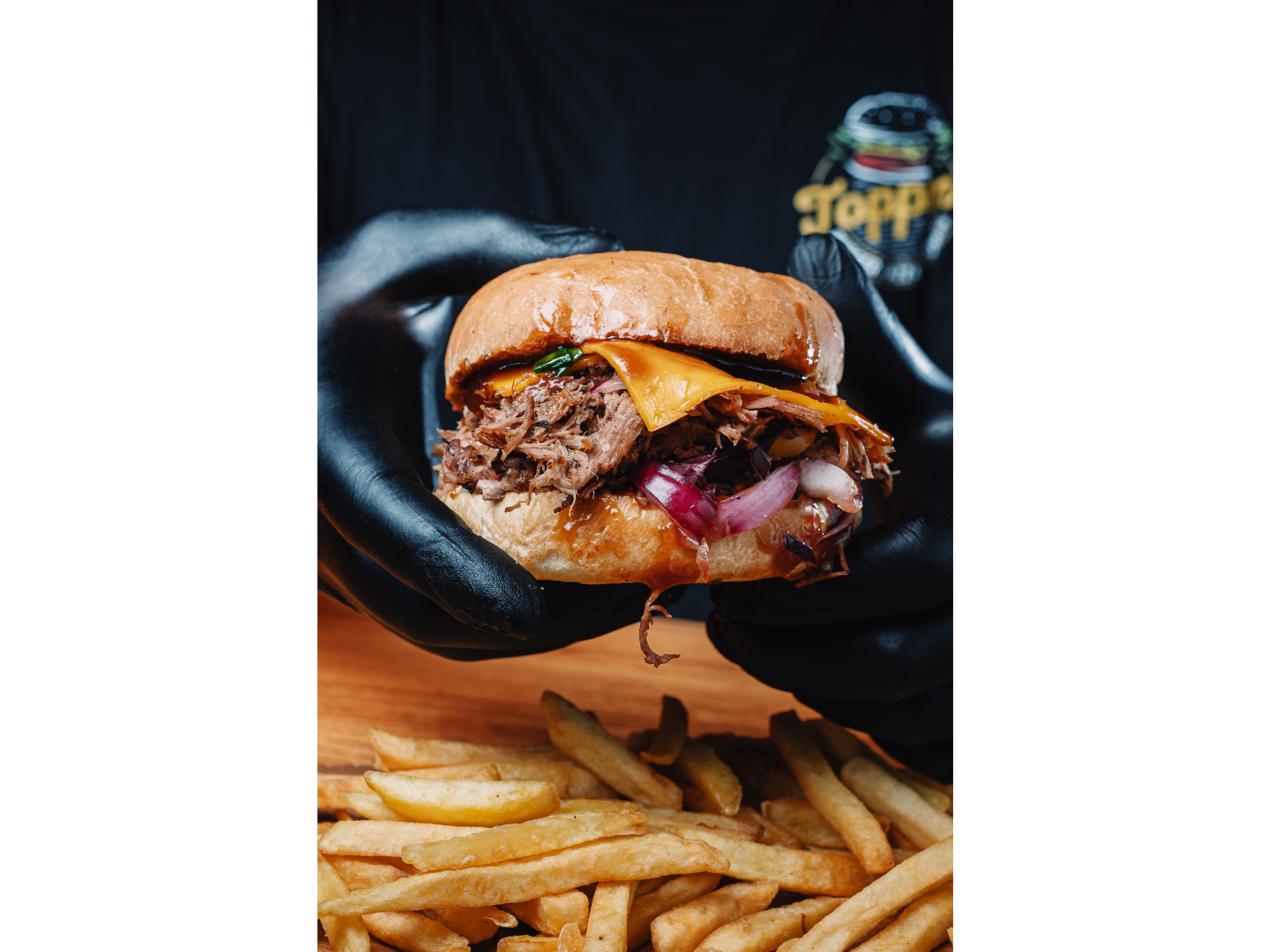 PAN DE BURGER, BONDIOLA DESMECHADA, DOBLE CHEDDAR, BACON, CEBOLLA DE VERDEO, CEBOLLA MORADA Y SALSA BBQ CON PAPAS FRITAS