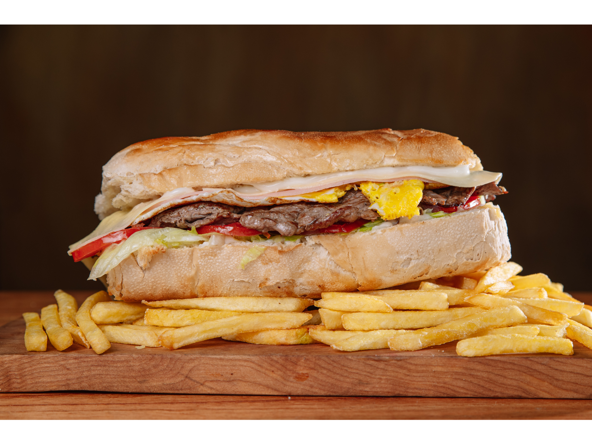 PAN, MAYONESA CASERA, QUESO , JAMON , HUEVO , LOMO 125grs , LECHUGA Y TOMATE ACOMPAÑADO DE PAPAS