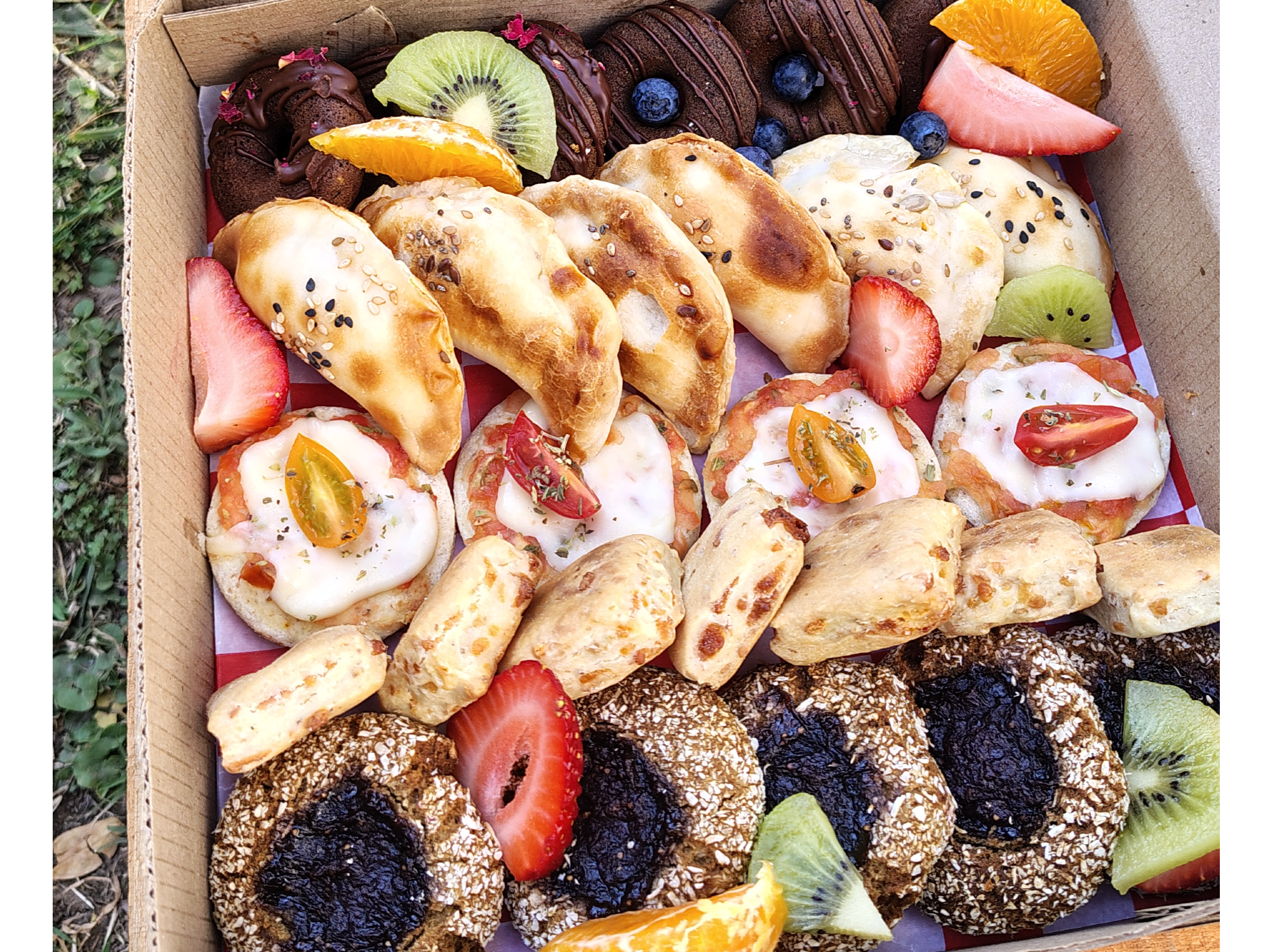Box degustación para los más peques. Sin azúcar, sin sal, sin lácteos! ❗Recomendación: Elegir productos que contengan ingredientes que ya hayan probado antes. 1 BOX ALCANZA PARA 6 NIÑOS APROX. * Incluye frutas de estación NO CONTIENEN: ❌ Sal ❌ Azúcar agregada ❌ Lácteos❌ Conservantes ❌ Colorantes ❗Pedidos con un mínimo de 2 días de anticipación. ❗Para reservar debes abonar la totalidad del pedido.