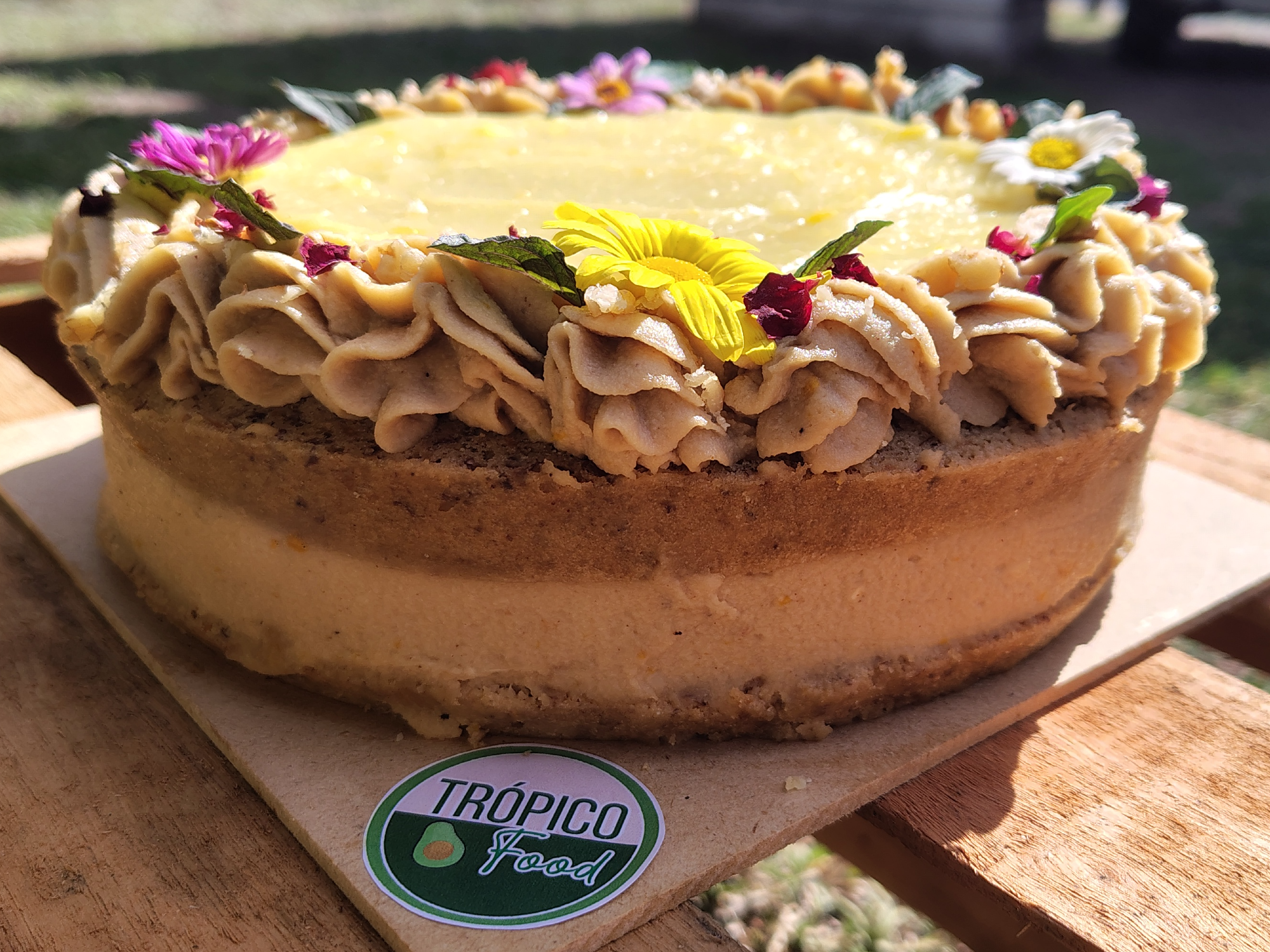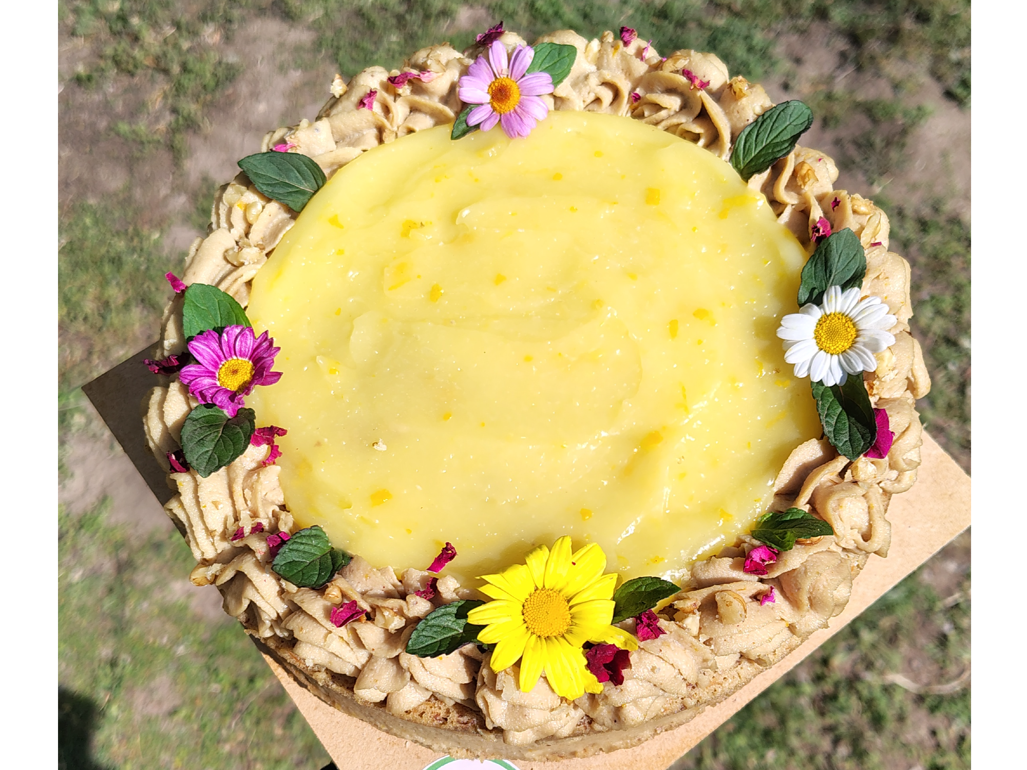 SIN GLUTEN SIN LÁCTEOS CON AZÚCAR - Bizcochuelo de zanahoria y almendras - Crema pastelera de naranja - Cremoso de castañas de caju - Deco: flores comestibles, nueces picadas y menta
